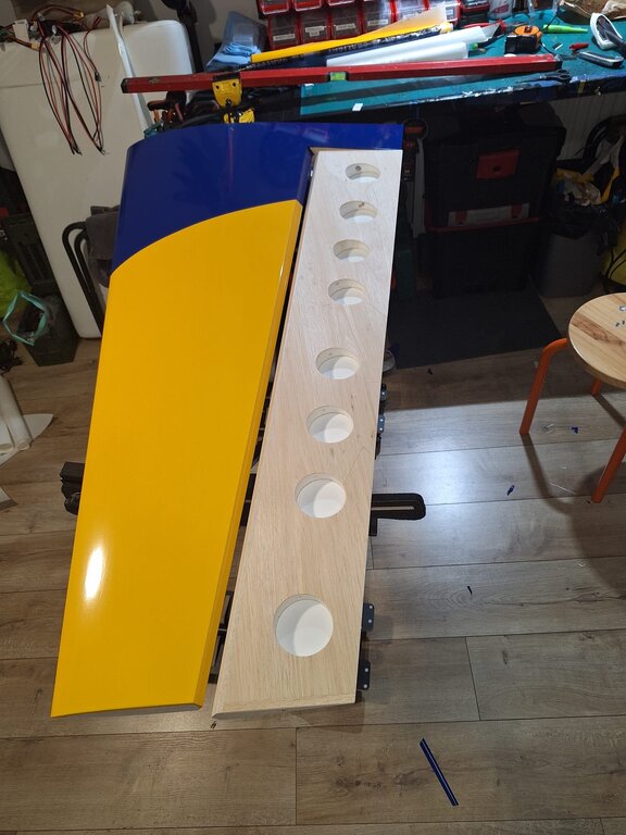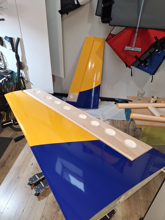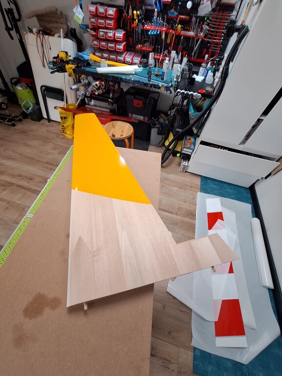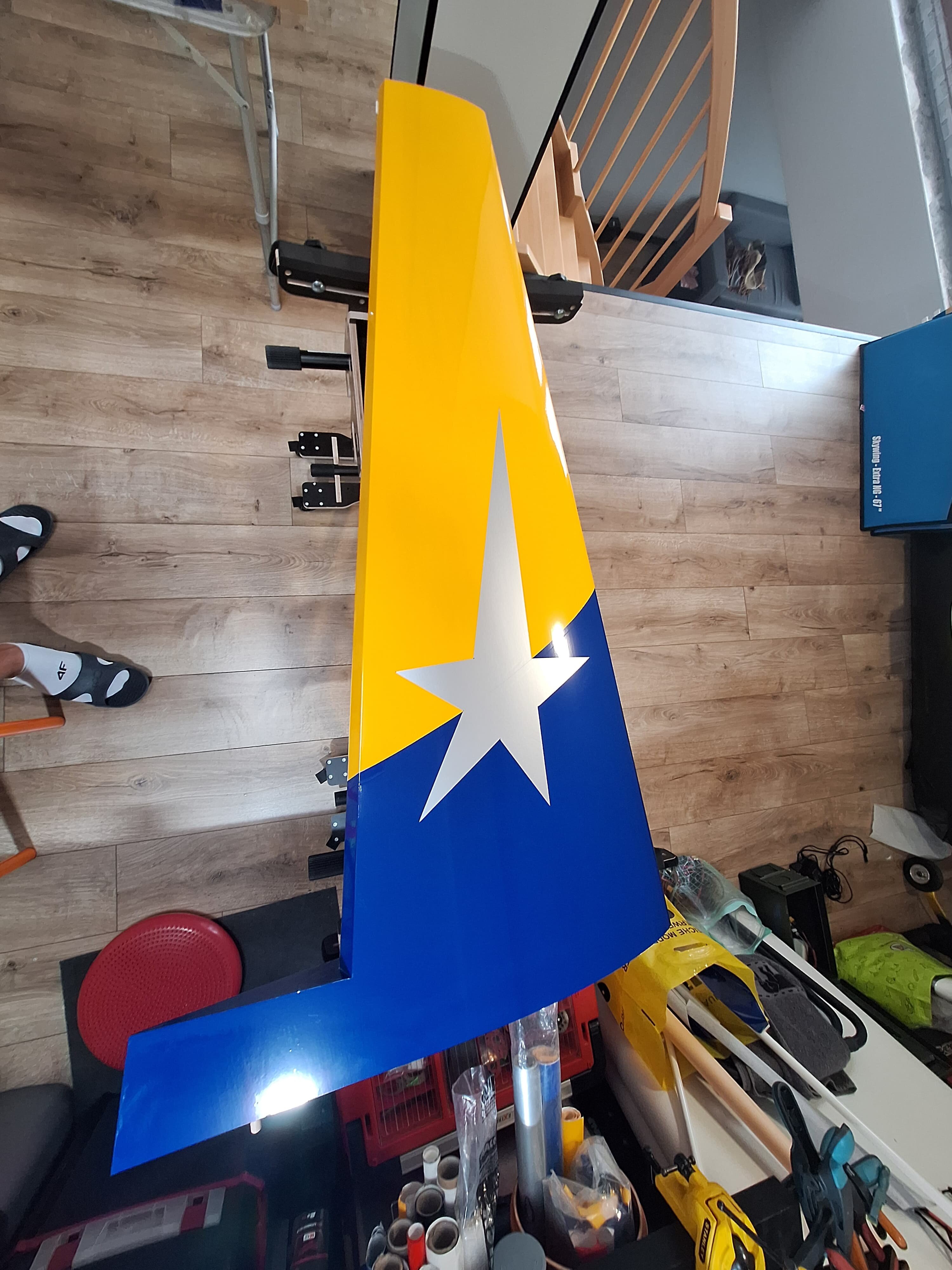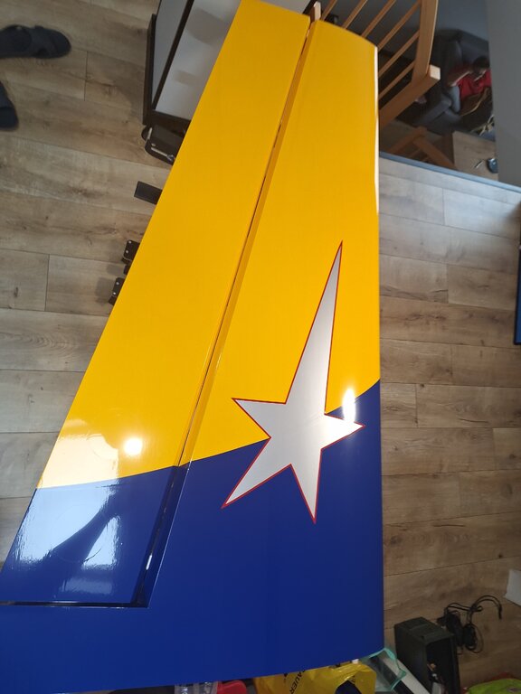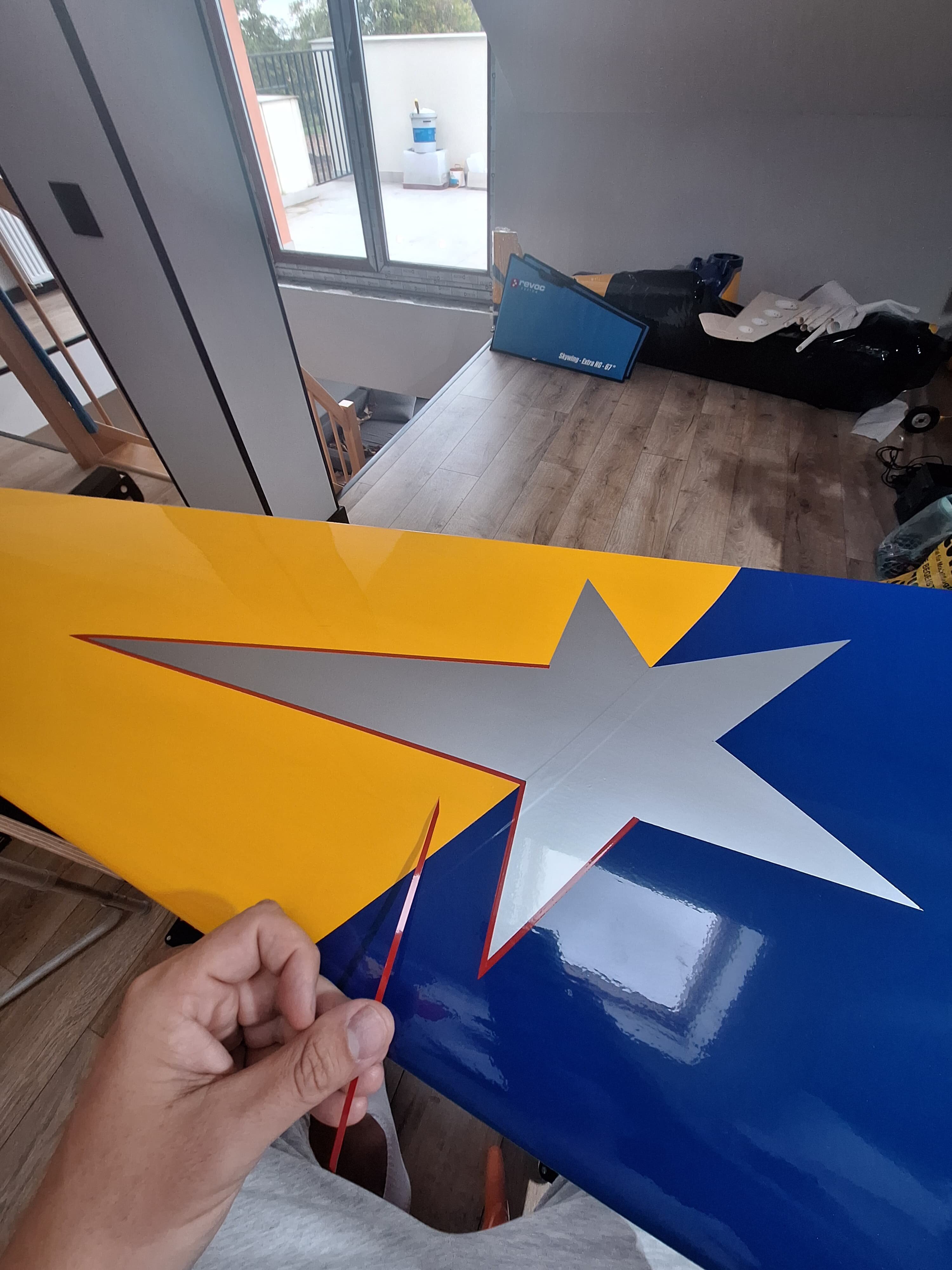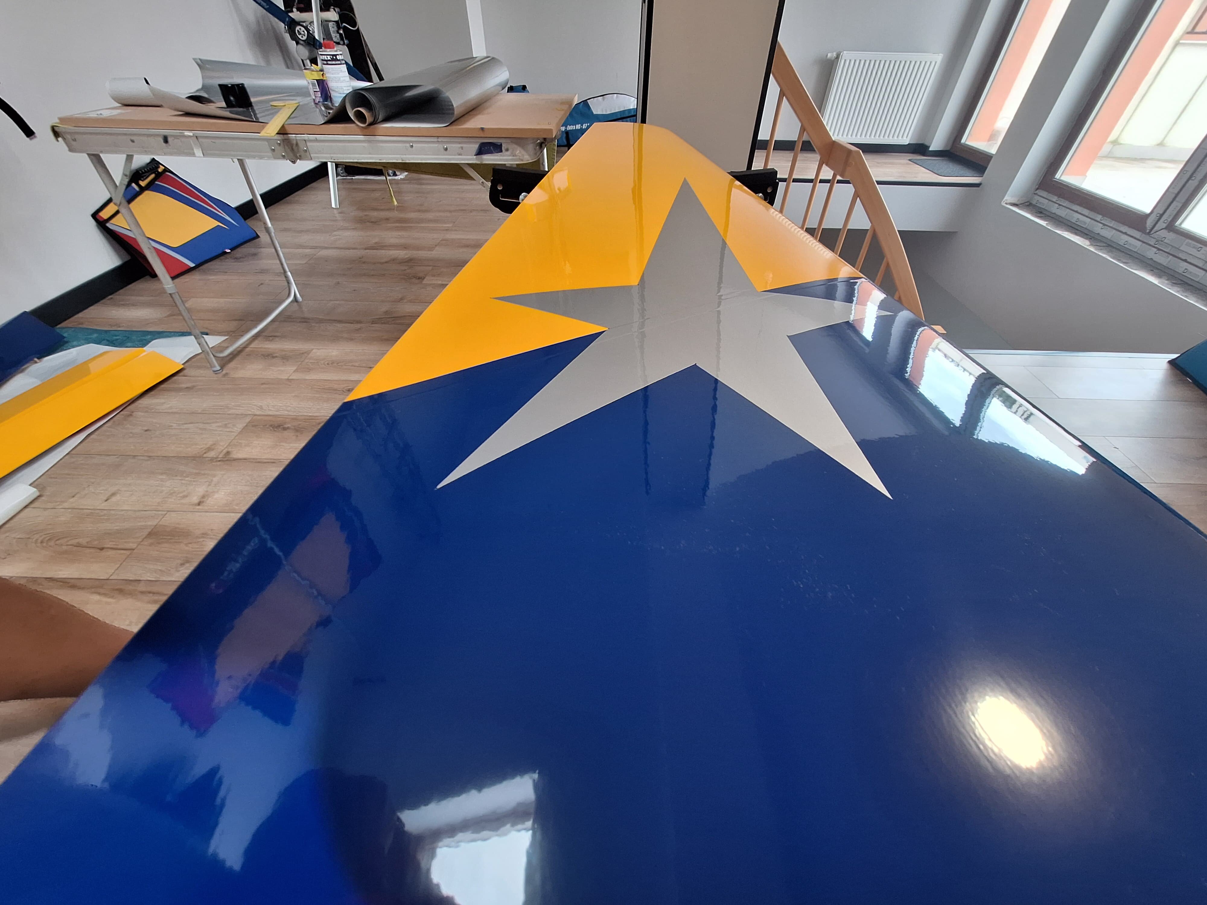 Czas na fotki z oklejenia drugiej strony skrzydeł Malowanie moje standardowe, jednak z drobnymi zmianami. Do oklejenia gwiazdki wokół wykorzystałem Oraline z firmy Oracover. -
