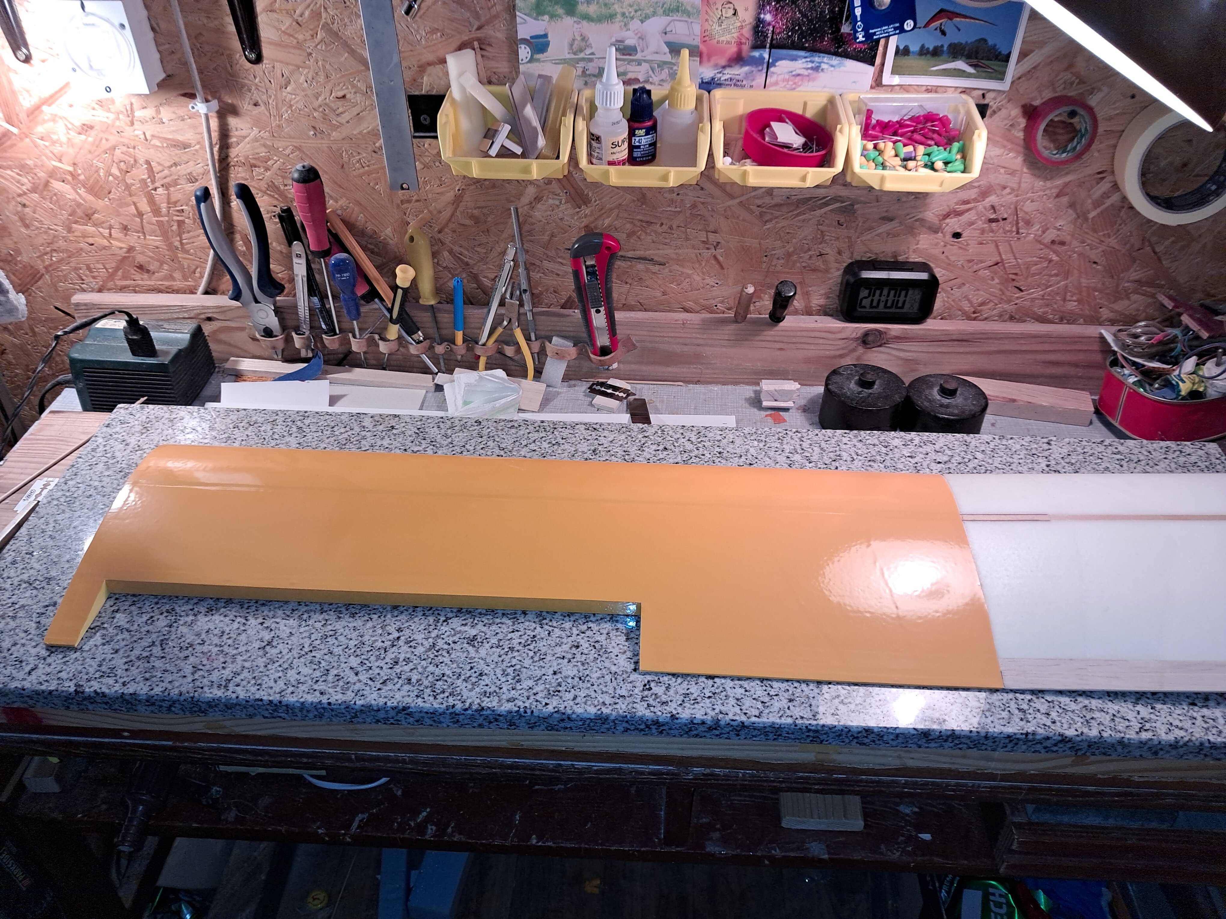 Dziś wolne to działam na modelarni. Przygotowania do świąt trwają ale zostałem wygoniony z kuchni abym nie przeszkadzał to tylko dobrze, można na modelarni posiedzieć🙂 Płat został oklejony folią Oracal ale najpierw jak już pisałem powyżej wykończyłem wcięcia na lotki folią w rolce. Narożniki po oklejeniu przeprasowałem żelazkiem temp. ok. 100st. Powyżej folia się topi a nie kurczy. Generalnie nawet przy tej stówie nie bardzo się kurczy ale taki jej urok. Jest też ciężka. Ale efekt moim zdaniem jest bardzo dobry i uważam ,że jest to świetny materiał pokryciowy do modeli rekreacyjnych albo budowanych w klubach przez młodzież ( o ile jeszcze w ogóle takie koła zainteresowań istnieją). Po zakończeniu pracy ręcznikiem papierowym złożonym w kostkę docisnąłem folię do płata kładąc go na równej desce. Wszystkie prace robiłem w rękawiczkach aby nie zatłuścić niczego Zbliżając się do końca relacji chciałbym wspomnieć ,że tego typu konstrukcje są dostępne praktycznie dla każdego i jeśli tylko mamy jakiś kąt do majsterkowania można spokojnie budować bo jest to konstrukcja dość prosta , tania i szybka w budowie. Jest to alternatywa dla gotowców z Epp gdzie płacimy mnóstwo kasy za kilka wyciętych na ploterze kawałków pianki.... Jestem zdania ,że jak już kupować to coś czego nie można wykonać samemu. Efekt po oklejeniu oceńcie sami oglądając fotki. Serwa zamówione , powinny przyjść jutro lub pojutrze. Po świętach płat będzie gotowy. Mam w planach zbudować kiedyś samolot który będzie miał kadłub wykonany ze styroduru i takie płaty , ale to już raczej elektryk będzie. Pewnie też zrobię relacje i będę Wam tu marudził na forum swoje modelarskie filozofie 😉 Aha ,może jeszcze dziś skrzydło dostanie jakiś ładny ozdobny pasek i napis.