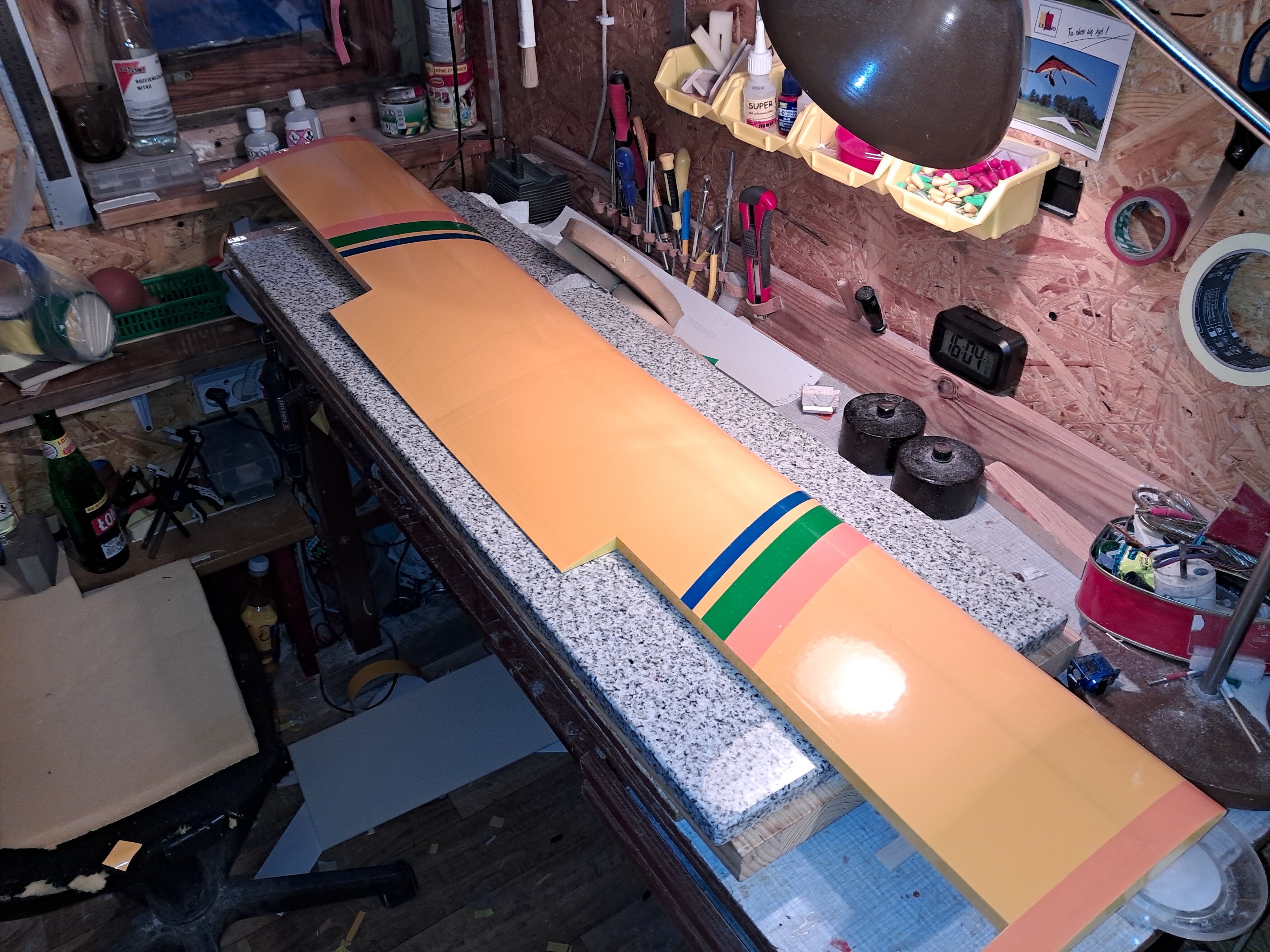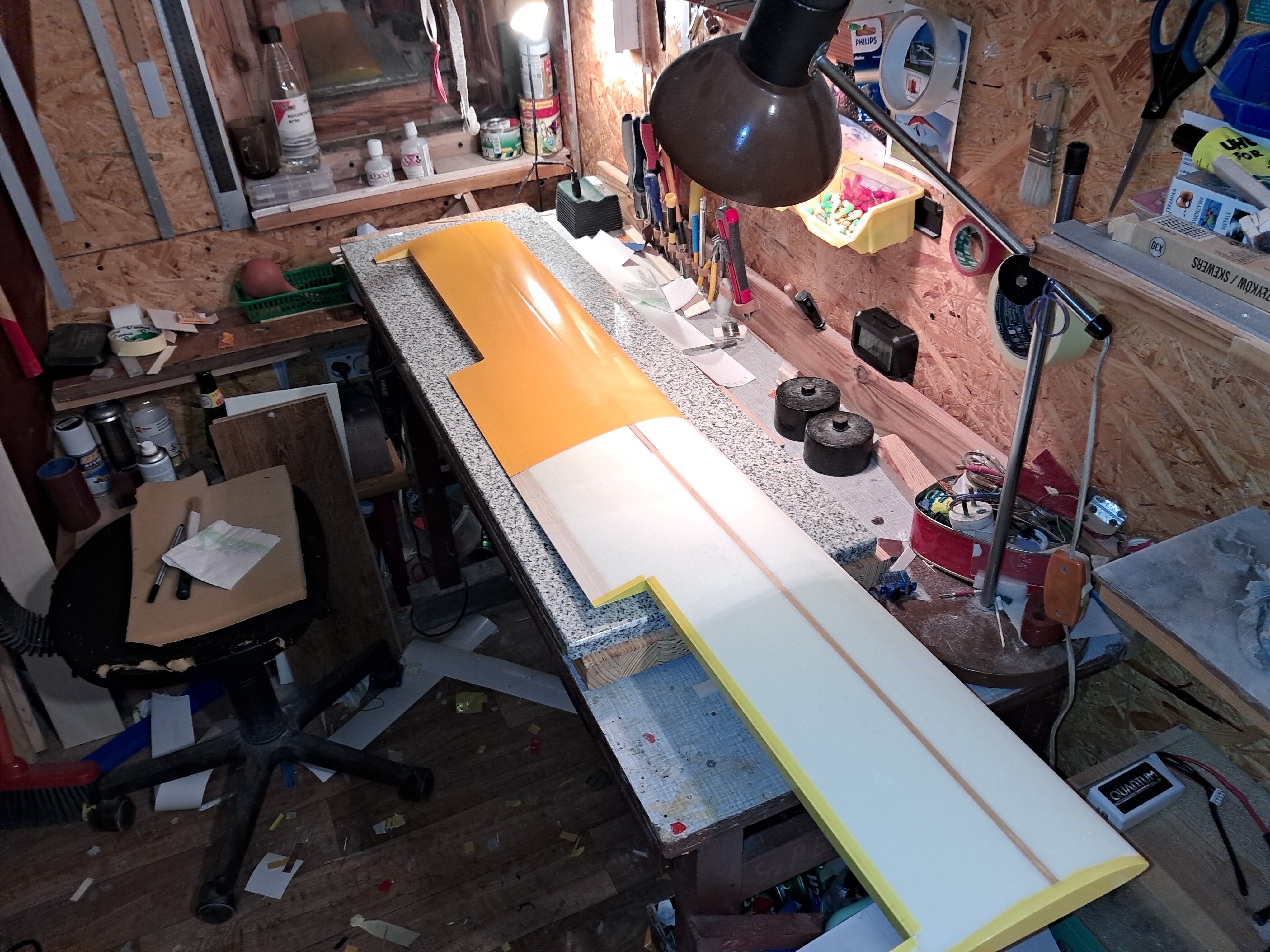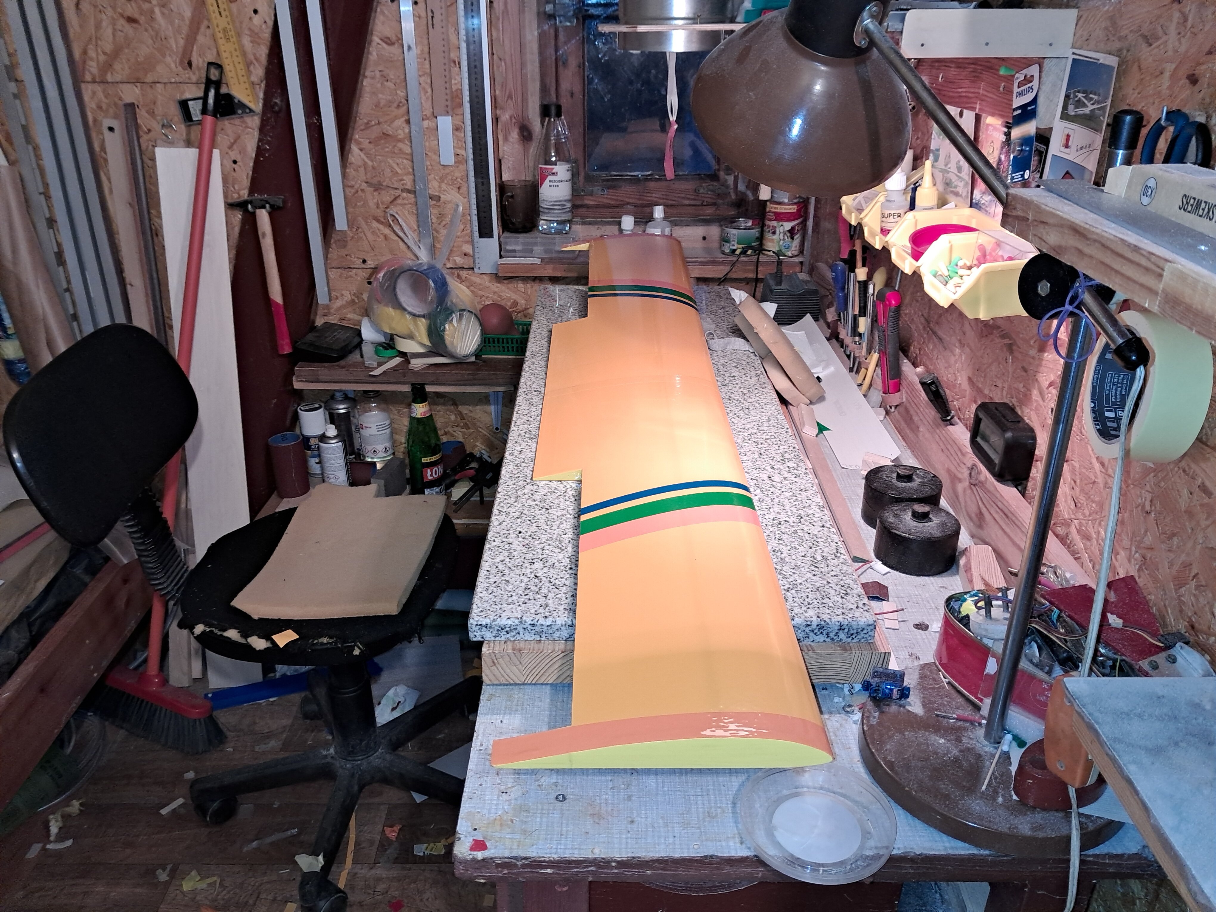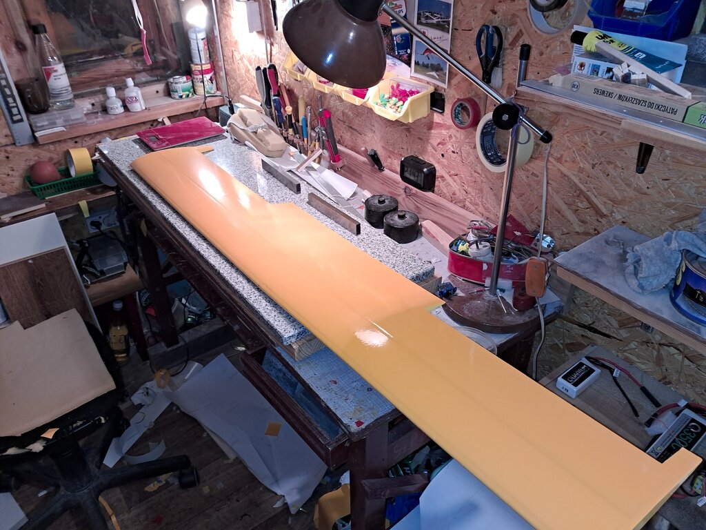 Jestem ponownie po dłuższej przerwie. Model ma się dobrze , dziś wrócił na stół , do modelu jest już maska , ta maska jest z PLA , i jest tylko na próbę do przymiarek , ale jest OK więc docelowa będzie taka sama tylko z innego materiału. Od jutra już się biorę ostro za kończenie modelu, ale pracy nie zostało zbyt wiele , oszlifować krawędzie natarć , oszlifować kadłub pod folię , zamontować nakrętki kłowe , raczej do zrobienia jest wykończeniówka. Ale model mi się podoba , najbardziej to jego gabaryty i mobilność , a że ma być kozackim modelem, to będzie w przyszłym sezonie czad -