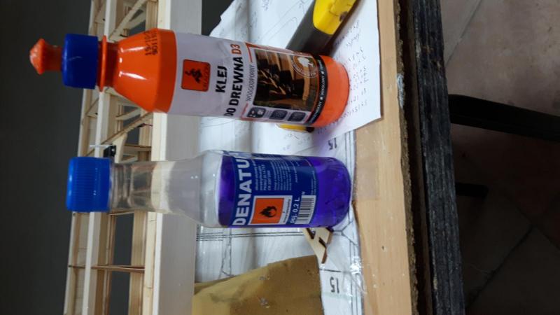 Witam Czas ucieka zimno w modelarni tak około 12 stopni trochę za mało na klejenie farelka i mam 16 zaczynam kleić.Pokazywanie samego klejenia to mało istotne aby tu się nad tym rozwodzić.Jednak zrobiłem fotkę rozprowadzając pędzelkiem klej Dociskam tym co mam pod ręka. Pędzelek próbuję wymyć nie wychodzi nawet zakupiłem Denaturat on tylko w szmatkę da się lekko oczyścić. Szukam macie Panowie jakiś dobre rozwiązanie usuwanie nadmiaru kleju z pędzla. Pozdrawiam Marian .