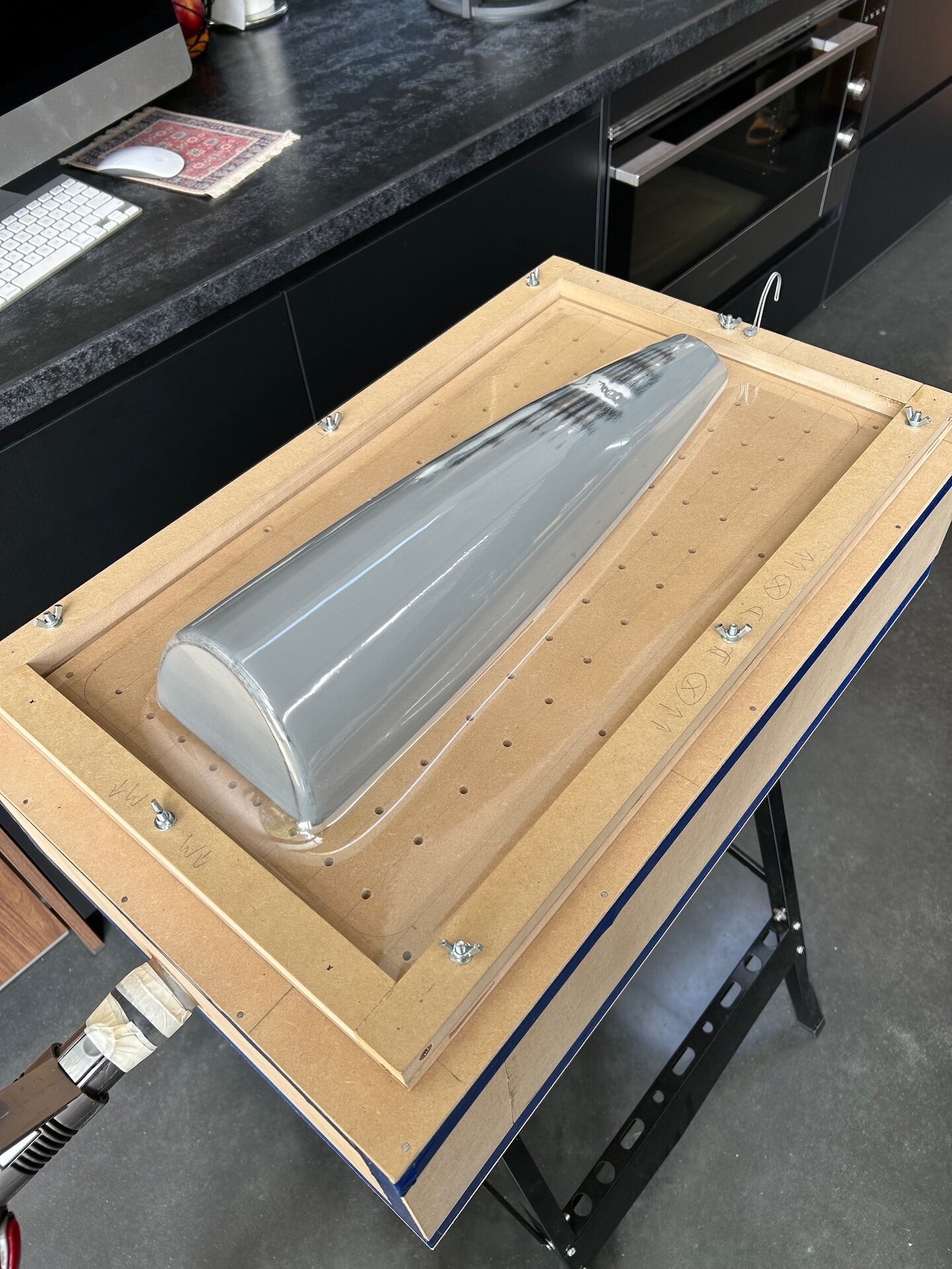 Witam Dzisiaj pierwszy raz zrobiłem owiewkę . Zbudowałem taka skrzynkę do uzyskania próżni. Wyszło to dobrze, użyłem piekarnika do podgrzania PETG 0.5 mm. Zona była odpowiedzalnia za obsługę temparatury piekarnika. Wyszło jej to dobrze i teraz musze się wykosztować na jakiś prezent. Mam poradę - róbcie to sami Owiewka wyszła całkiem dobrze. Prawe skrzydło skończone , jest gotowe to podkładu. Czekam zamknięcie kabinki i wtedy będę mógł zalaminowac kadłub.13 punktów