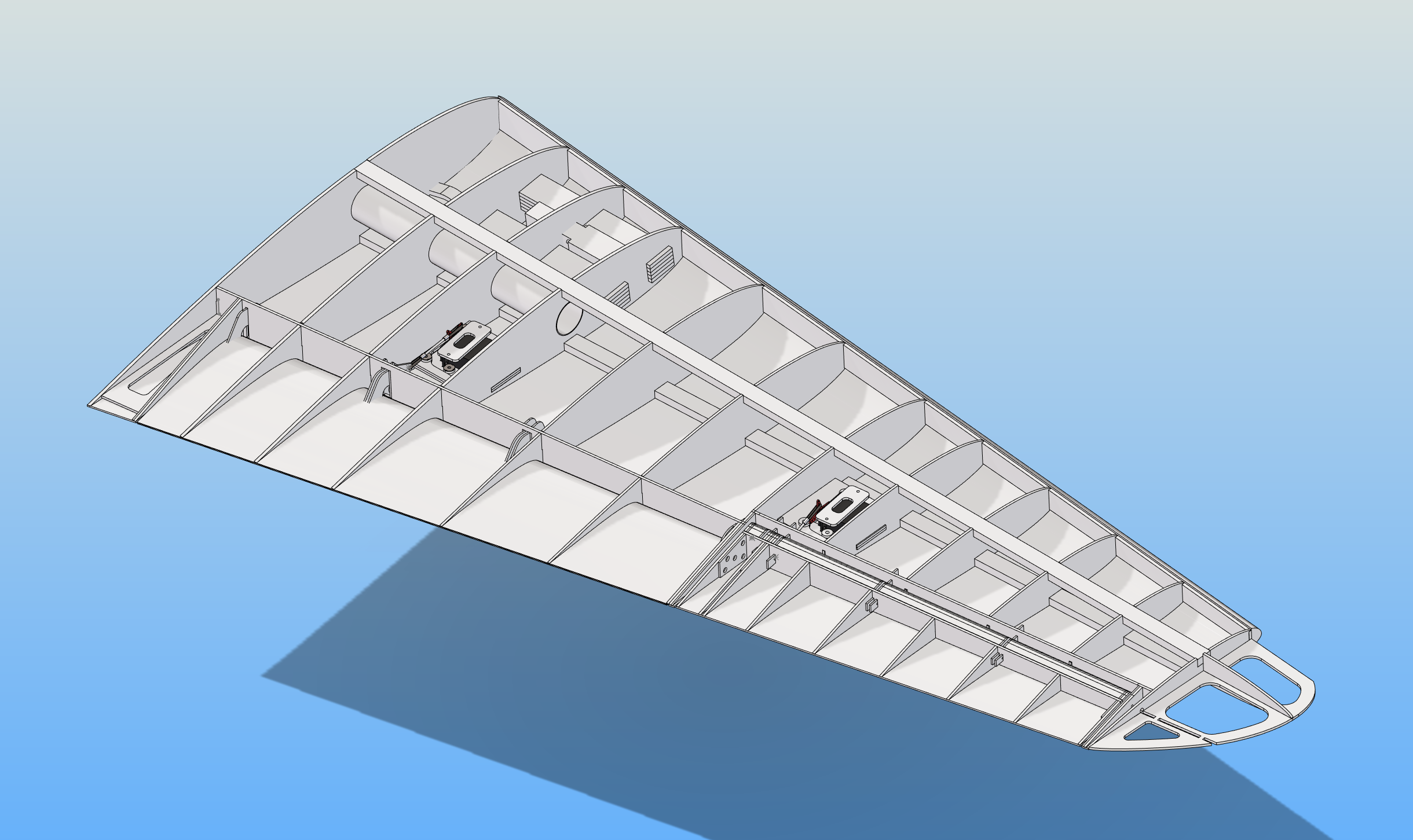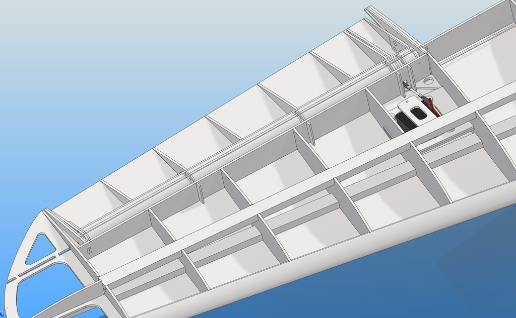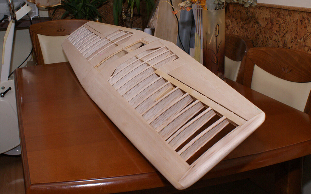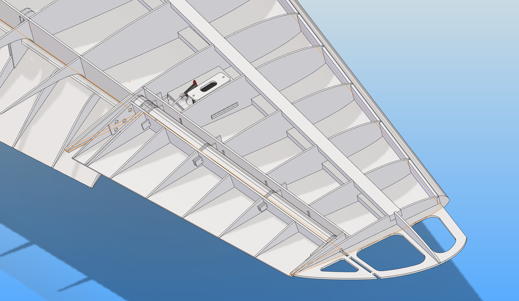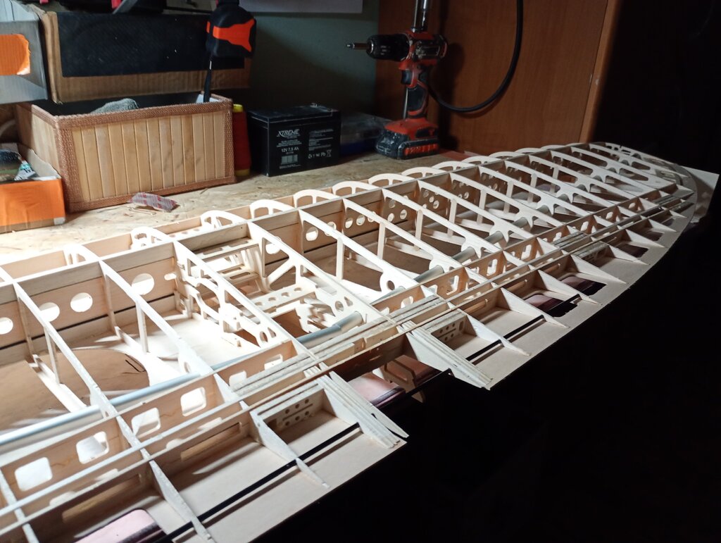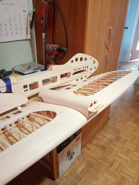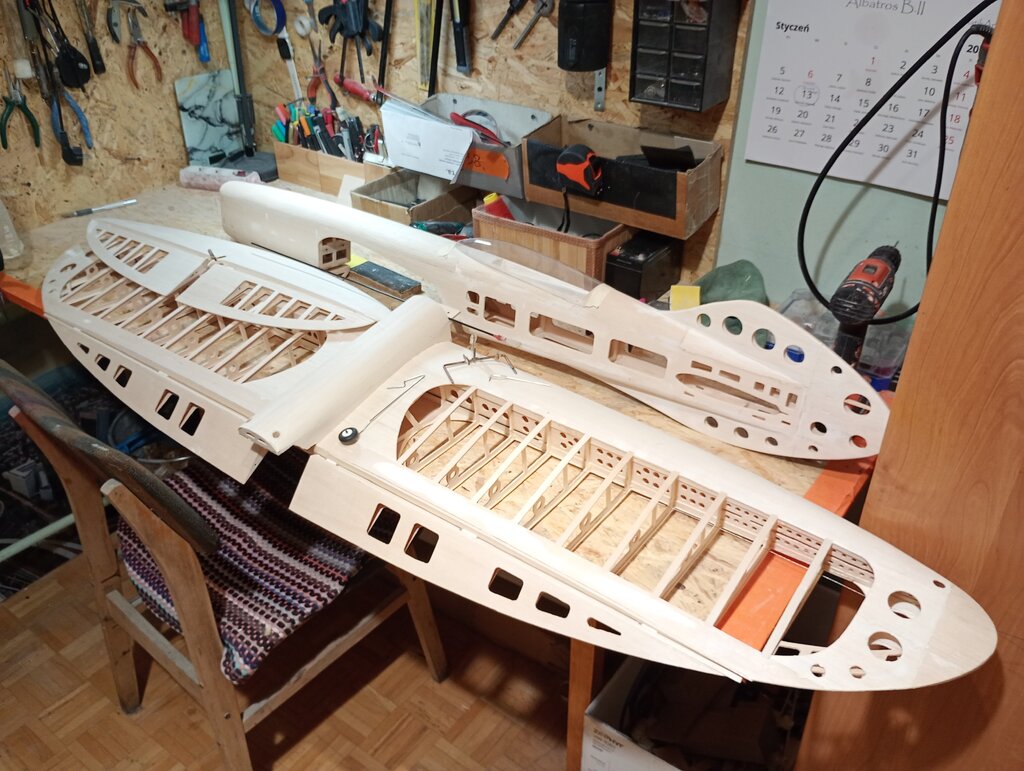 No i zdecydowana większość drewna jest gotowa: Zdecydowana większość, bo brakuje kilku wpustów. Samo skrzydło konstrukcję ma +/- klasyczną: Tu bez górnego poszycia, na skrzydle i na lotce. Klapa będzie miała klasyczną konstrukcję, obustronnie kryta balsą 0,8mm. Przy pełnym otwarciu klapa ma przedmuch pod skrzydłem, co powinno ładnie obniżyć prędkość lądowania. Napęd całkowicie wewnętrzny. No i tutaj zdjąłem górne poszycie klapy, żeby konstrukcję w środku pokazać. No i lotka podobnie rozwiązana jak stery, też z napędem wewnętrznym Teraz parę pierdół dorobić i biorę się za podwozie. No i jak podwozie będzie, to jeszcze trzeba dorobić wnęki podwozia. Jak się przebiję przez całość drewna, to wrzucę model 3D całości.1 punkt