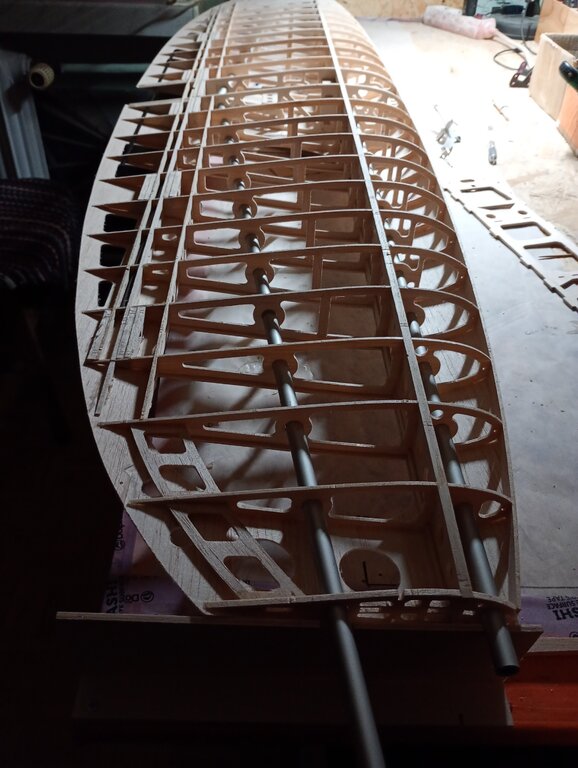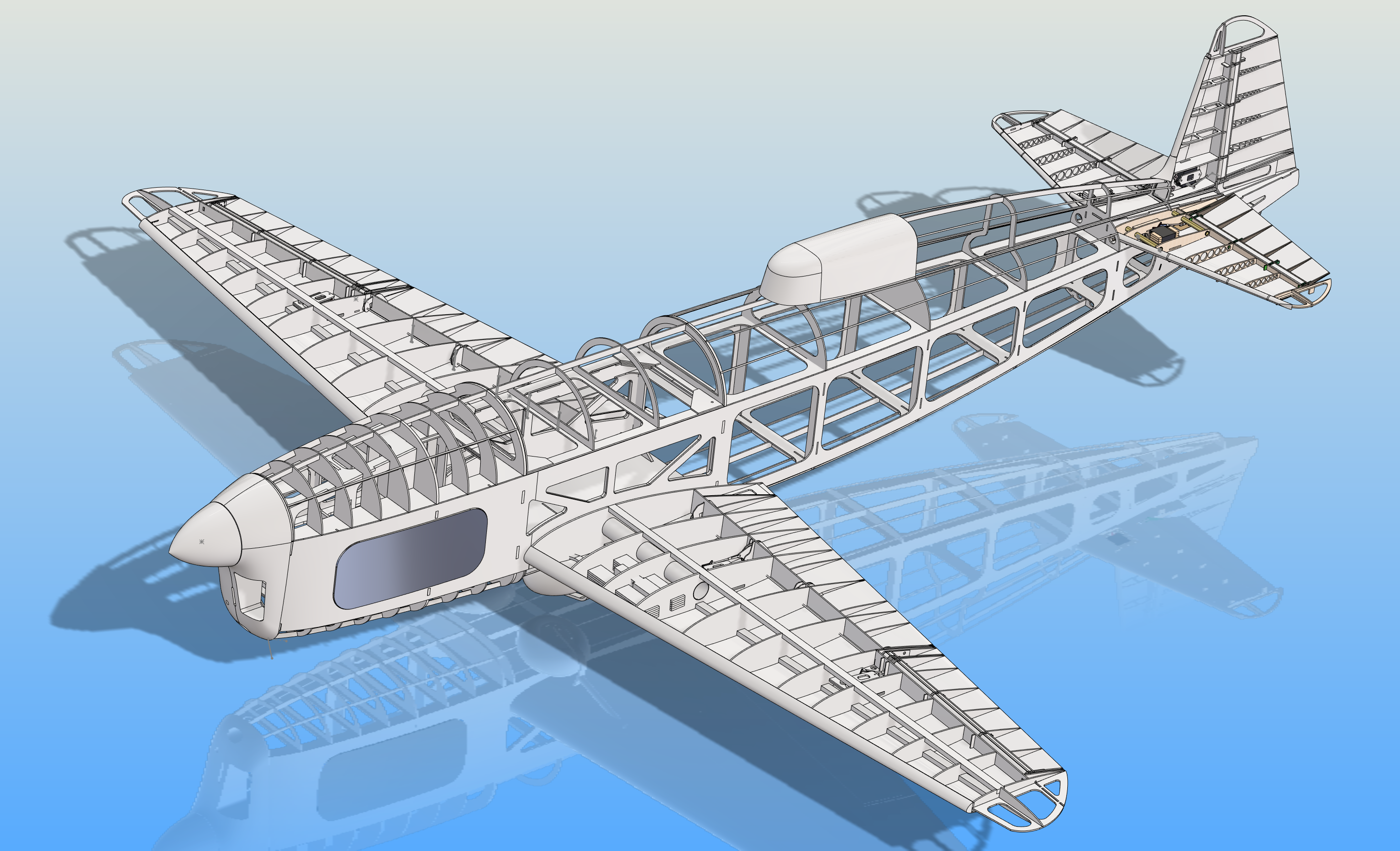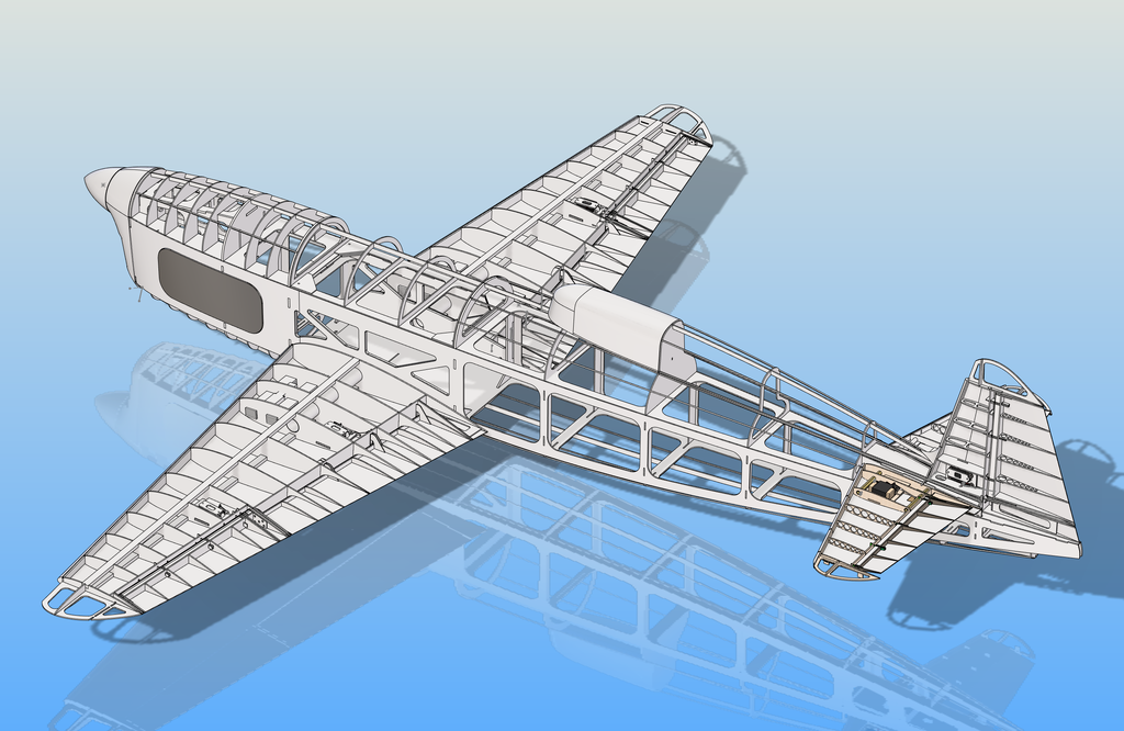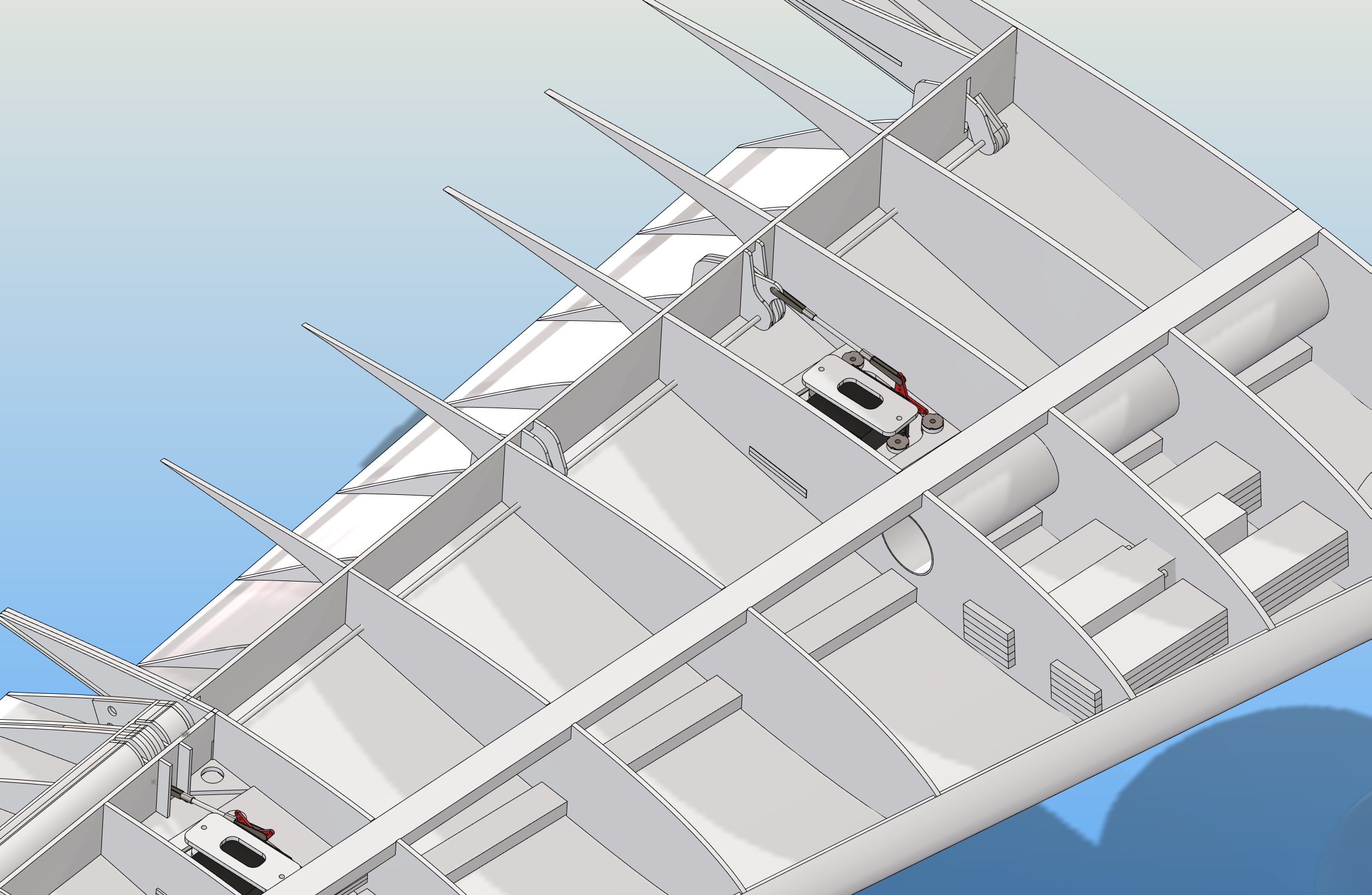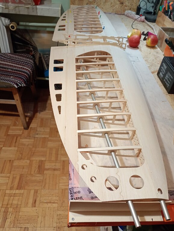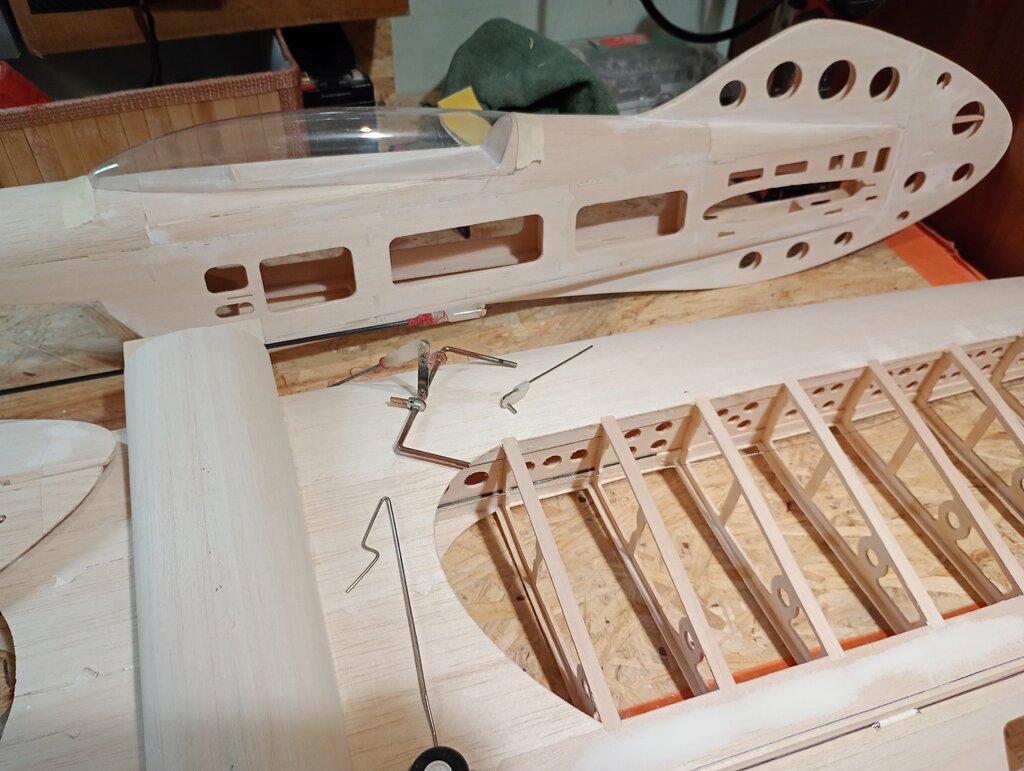 No i zdecydowana większość drewna jest gotowa: Zdecydowana większość, bo brakuje kilku wpustów. Samo skrzydło konstrukcję ma +/- klasyczną: Tu bez górnego poszycia, na skrzydle i na lotce. Klapa będzie miała klasyczną konstrukcję, obustronnie kryta balsą 0,8mm. Przy pełnym otwarciu klapa ma przedmuch pod skrzydłem, co powinno ładnie obniżyć prędkość lądowania. Napęd całkowicie wewnętrzny. No i tutaj zdjąłem górne poszycie klapy, żeby konstrukcję w środku pokazać. No i lotka podobnie rozwiązana jak stery, też z napędem wewnętrznym Teraz parę pierdół dorobić i biorę się za podwozie. No i jak podwozie będzie, to jeszcze trzeba dorobić wnęki podwozia. Jak się przebiję przez całość drewna, to wrzucę model 3D całości.1 punkt