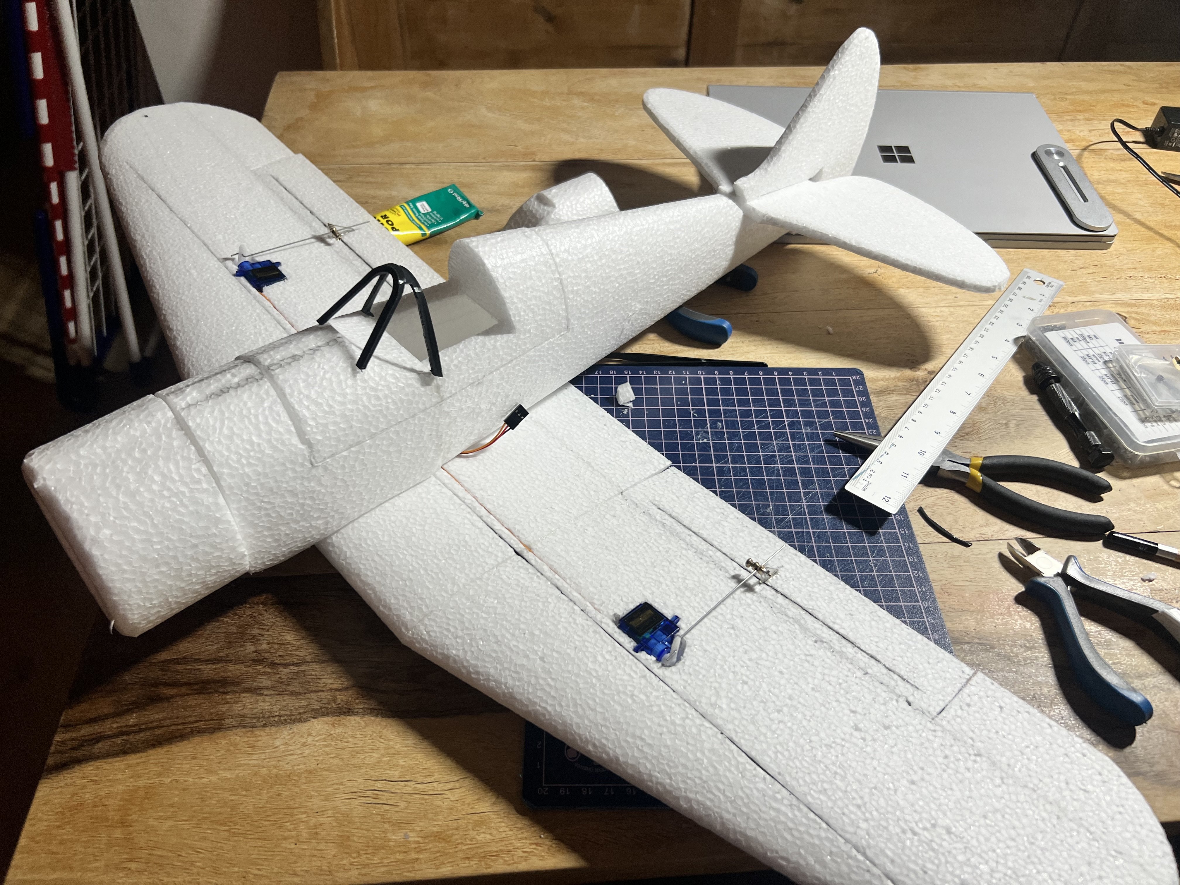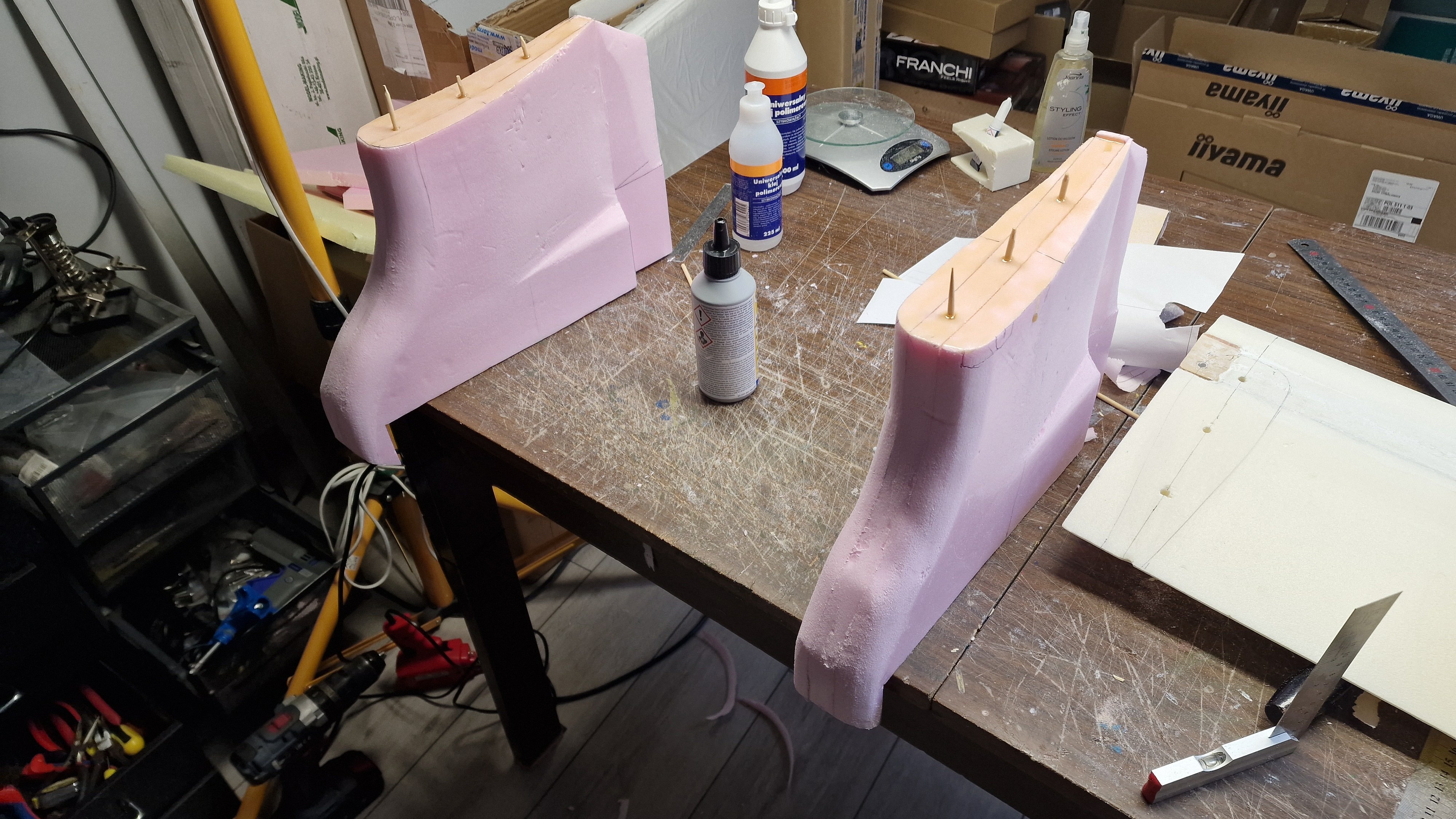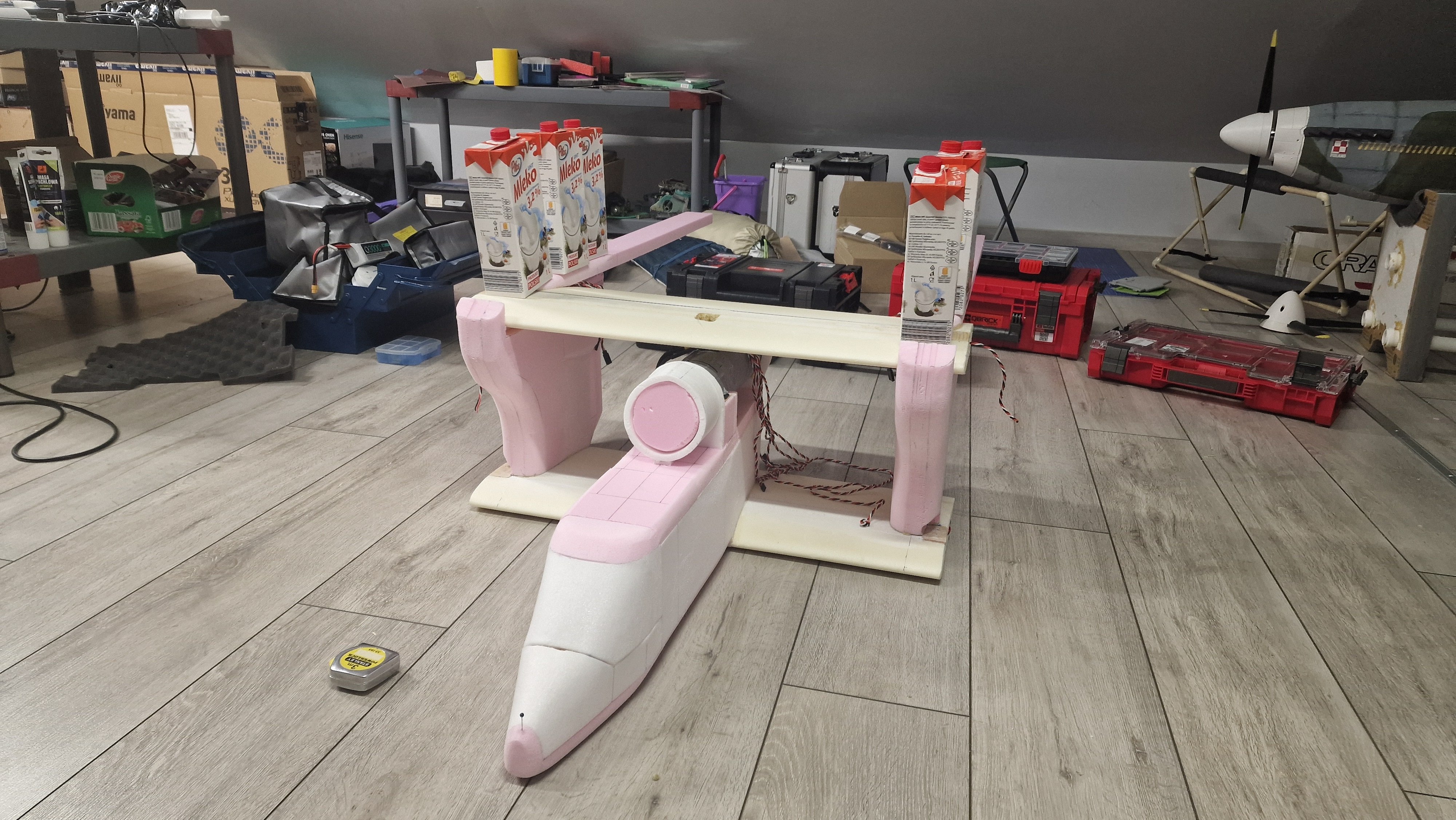 Sponsorem dzisiejszego postu jest mleko z Lidla 🙂 W kadłubie wyciąłem negatyw profilu gorącym drutem i skleiłem z dolnym centropłatem. Tutaj tylko przymiarka kształtów zbiorników i górnego płata, czy to się wszystko zgrywa. Noooo, wygląda to już fajnie panowie. W górny centropłat wkleiłem kawałki wędki, okazuje się, że są o wiele lżejsze niż rurka węglowa o podobnym rozmiarze a wystarczająco sztywne. Rurka będzie obudowana pianką, która będzie robić za belki ogonowe.4 punkty