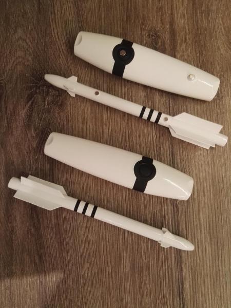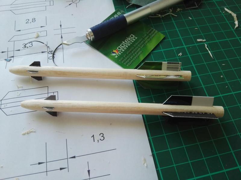 Pylony przygotowane do podczepienia uzbrojenia- widoczne blaszki z nożyka modelarskiego, które mocno będą trzymać magnesy neodymowe przyklejone do rakiet itp. Warto zbierać stare pisaki lub pojemniki po tuszach od rzęs ????. Dobrze nadają się na zbiorniki, zasobniki. Ale o tym w kolejnych postach.