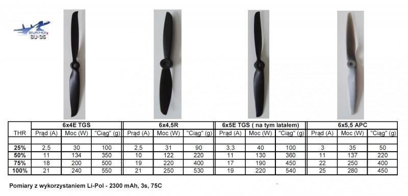 Takie śmigło użyłem do prób. https://www.banggood.com/Sonicmodell-F1-Wing-FPV-RC-Airplane-Spare-Part-6045-6X4_5-Propeller-p-1290701.html?rmmds=myorder&cur_warehouse=CN To śmigło pobiera max 21A i "ciąg"na wadze tylko 280g. A wg producent silnik Sunnysky A2212-6 2450kV ze śmigłem 6x4,5 dla zasilania 11,1V może pobrać max 34A i mieć ciąg 1090g (patrz tabela 2 posty wyżej). Fikcja?