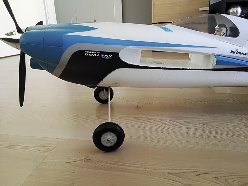 Umiejętność lądowania muszę jeszcze poćwiczyć. Aby nie uszkodzić podwozia i modelu przy lądowaniu na trawie tymczasowo zrobiłem zamianę - zdemontowałem osłony kół a koła zmieniłem z 50mm na 75mm. Wkrótce ponowne loty z nowym podwoziem.