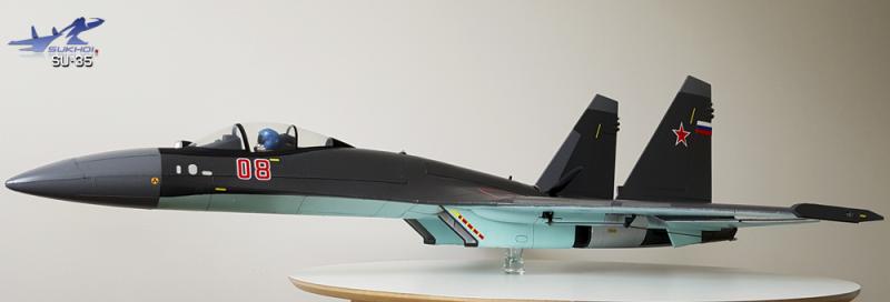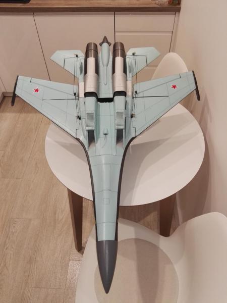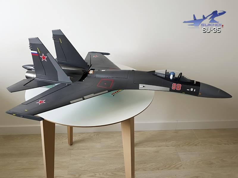 SU-35 Specyfikacja: Długość: 1050 mm Rozpiętość skrzydeł: 735 mm Skala: 1:20 Wyposażenie: Silnik DYS D2826 2200kv Outrunner Motor Śmigło TGS 6x4,5R bullet Regulator 30A ESC HK Blue Series Li-Pol 1300 3S 45-75C Serwo 2 x 12g odbiornik HK 4 kanałowy Komplet oświetlenia - pozycyjne, stroboskop, lądowania + imitacja dopalacza (2 pierścienie 16xLED każdy). Oświetlenie pozycyjne, stroboskop, lądowania podłączone pod kanał nadajnika (5,5V), imitacja dopalacza podpięta przez sterownik Arduino pod kanał odbiornika THR. Pylony pod skrzydłami+rakiety i zasobniki do walki elektronicznej na magnesach neodymowych. Waga modelu bez akumulatora: 567g. Powierzchnia skrzydeł 15,6 dm2 Waga modelu do lotu z akumulatorem 1300mAh: 687g Obciążenie przy wadze 687g wynosi 44 g/dm2 "Ciąg" mierzony na wadze 660g, pobór prądu 26A Historia modelu - loty i przeróbki autorskie http://pfmrc.eu/index.php/topic/71156-su-35-epo/