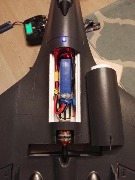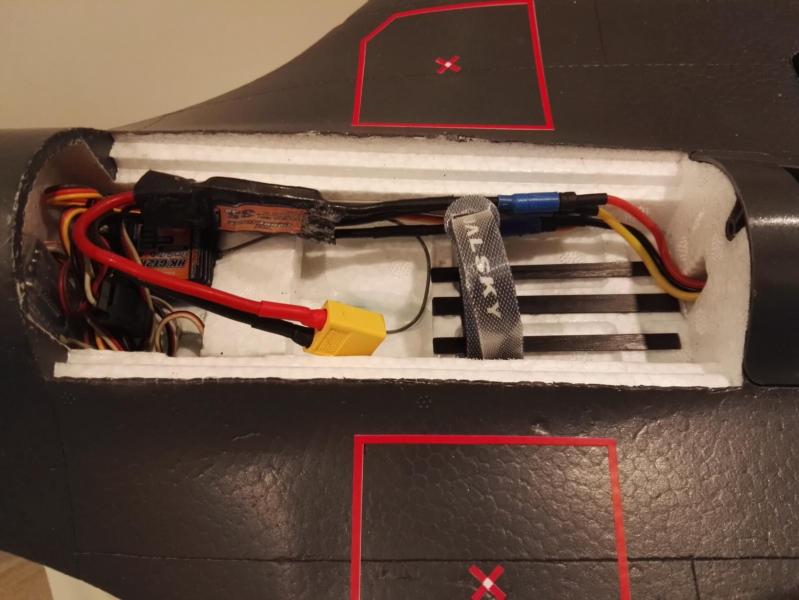 Poukładałem przewody, regulator, procesor Arduino, odbiornik 4-ro kanałowy tak aby po włożeniu akumulatora dobrze wyważyć model. Jest dużo miejsca na pakiet 1300mAh (3s) i spokojnie mieści się pakiet 2200mAh (3s).