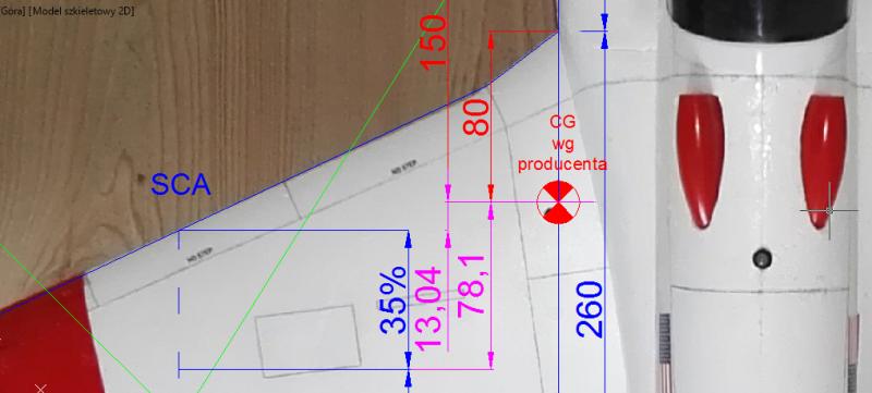 Waga modelu z elektroniką ale bez pakietu LiPo to 507 g. Z pakietem 2200mAh model waży 700g. Ciąg ma wystarczający - wyrywa go z ręki. Z pakietem 1300mAh model waży 610g a wtedy trzymając go za dziób rwie pionowo w górę aż miło. Różnica 90g dla ciągu w pionie jest mocno odczuwalna. Nie mam śmigła trójłopatowego a w tabelach producenta nie widziałem zaleceń do stosowania takiego rozwiązania. Obecnie mam założone śmigło 6x5e - w innych moich modelach latałem już na identycznych zestawach silnik-śmigło i byłem z tego zestawu zadowolony. Co do nadajnika - używam tego typ nadajnik pierwszy raz ze względu na małą ilość miejsca w komorze na elektronikę (dołożyłem sterownik Arduino), potrzebę wykorzystania tylko 3 kanałów (silnik, 2x serwa + zasilanie na 3 diody LED). Sprawdzę jego zasięg przed lotem. Jeżeli okaże się zbyt mały to odbiornik Turnigy 8CH też się zmieści. Środek ciężkości wypada w osi orczyka serwomechanizmów - 85mm od krawędzi skrzydła. Tak wypada wg relacji użytkowników tego modelu - producent nie zamieścił takiej informacji w swojej instrukcji.