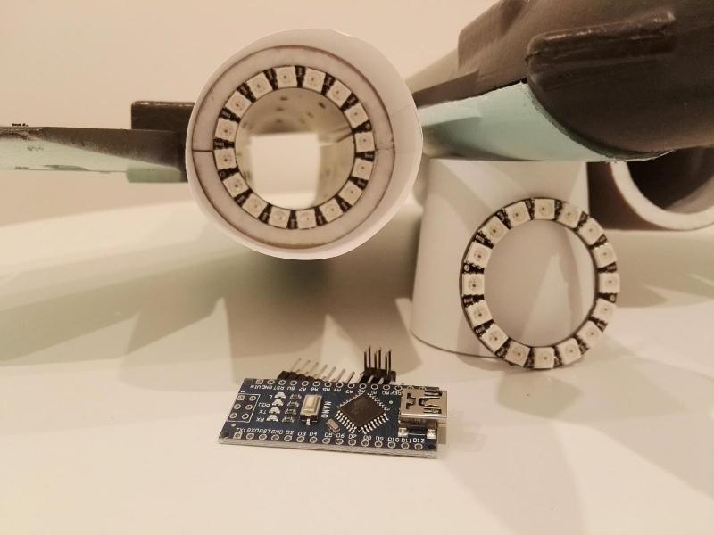 Tak, na Arduino podłączyłem pierścienie LED. Muszę popracować tylko w programie nad kolorystyką aby na max przepustnicy świeciły kolorem bardziej jasno niebieskim. Pozostałe 3 diody ( czerwona, zielona i białą migająca) podłączyłem równolegle do wolnego kanału odbiornika.