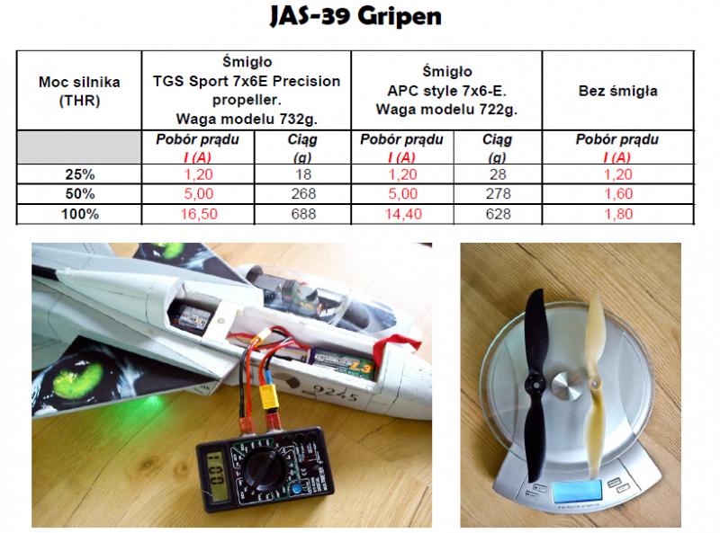 Ja po testach w swoim modelu wybrałem śmigło TGS - cięższe ale generowało większy ciąg przy 100% mocy bo tak głównie latam Gripenem. Wyrzut z ręki - żadnego problemu. Wykonaj Robert próby ze śmigłem TGS 6x5E - mam takie w F-18 i lepsze mam osiągi niż z TGS 6x4. -