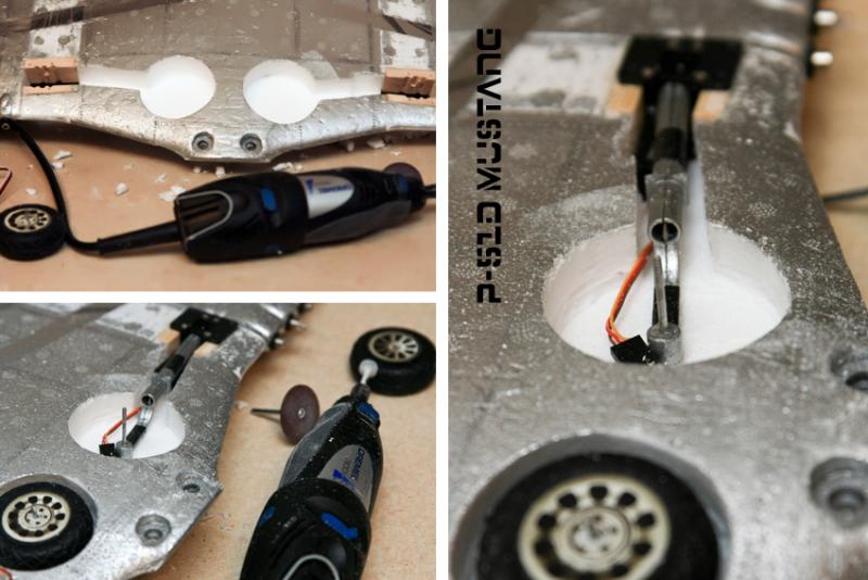 13. Dzisiaj skończyłem drążenie wnęk podwozia. Mój warsztat. Następny ruch to opracowanie tych wnęk - oklejenie (co wzmocni skrzydło) przezroczystą klisza i pomalowanie na srebrno. W miejscu gdzie przebiega w skrzydle okablowanie (obecnie zaklejone srebrną taśmą) włożę i przykleję dla dodatkowego wzmocnienia płaski pręt węglowy. Niestety po zamontowaniu oryginalnej goleni podwozia i koła okazało się, że koło wystaje o około 4mm. Mechanizmu nie zagłębie bo będzie wystawać ponad górną część skrzydła. Rozważam więc następujące warianty: 1. oryginalna cała goleń (drut i plastik) + cieńsze koło 2. oryginalne tylko pionowa część goleni (drut i plastik) bez tej części która jest wygięta + oryginalne koło (które mocowane na samym drucie "wpadnie" głębiej 3. oryginalne tylko pionowa część goleni (drut i plastik) bez tej części która jest wygięta + cieńsze koło (które mocowane na samym drucie "wpadnie" głębiej 4. Odchudzone nowe golenie podwozia (oryginalny drut na który przykleję i pomaluję słomkę do picia napojów ) + oryginalne lub nowe koło. Przymiarki pokażą który wariant będzie dobry.