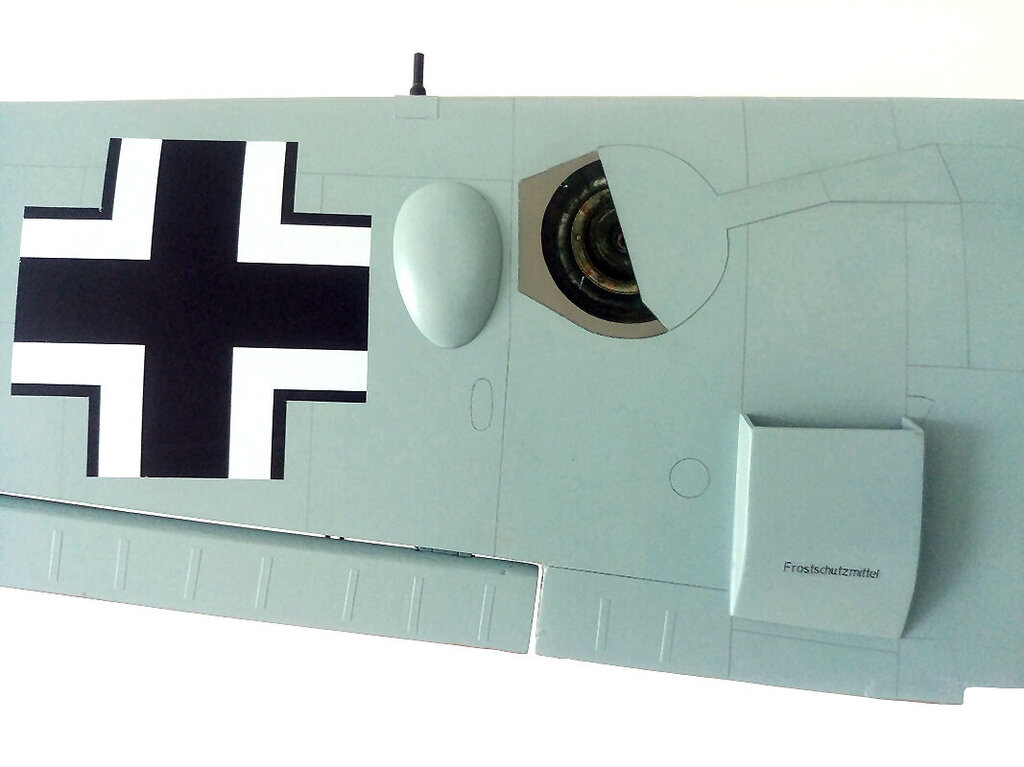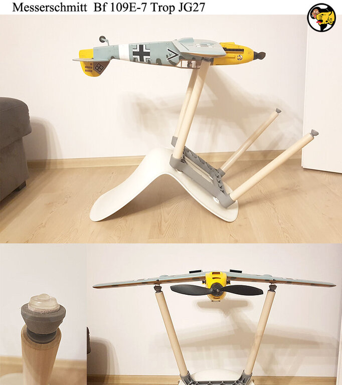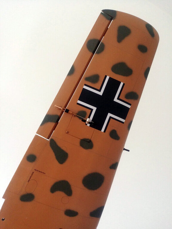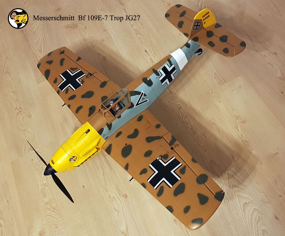 Messerschmitt Bf 109E7 Trop Długość 74 cm Rozpiętość skrzydeł 89 cm Skala 1:11 Waga modelu bez akumulatora: 610g. Waga modelu do lotu z akumulatorem: 1300mAh - 745g, Powierzchnia skrzydeł to 14,85 dm2, obciążenie przy max. wadze 745g wynosi 50,16g/dm2 Silnik: Emax CF2822 (1200 kV) - Śmigło 9x6 (SF) - ciąg mierzony 770g, 9x6 E- ciąg mierzony 750g, 10x4,7 (SF) - ciąg mierzony 800g Emax GF2210/20 (1534 kV) - Śmigło 9x6 (SF) - ciąg mierzony 720g, 9x6 E- ciąg mierzony 780g, obecnie Emax XA2212 980kV - Śmigło 10x5, 10x5E - ciąg mierzony 730g Serwo steru wysokości 1x Serwo lotek: 2x Akumulator Tattu 1300mAh 3s 45C Regulator: HK 30A Blue Series Historia modelu i przeróbki autorskie: