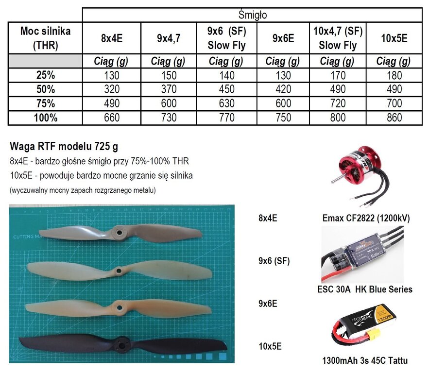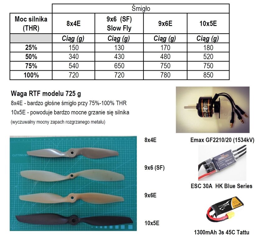 8. Pomiary zakończone. Mój wybór padł na 10x4,7(SF) choć jako Slow Flayer średnio pasuje wizualnie do tego modelu. Myślę, że z 9x6E też wystartuje przy rzucie z ręki. Waga RTF modelu to 725 g.