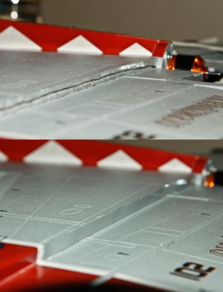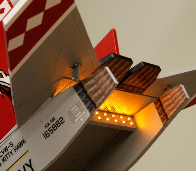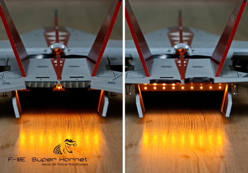 Brałem pod uwagę fakt działania listwy z oświetleniem jako hamulca dlatego zrobiłem ją możliwie jak najniższą - ma 1,7 cm. W tym modelu za "wektor ciągu" robiło wychylenie dysz silnika które połączone są z tylnymi sterami i tu się zgodzę że w dolnym ich położeniu listwa ograniczy ich działanie.Loty pokażą na ile ta modyfikacja wpłynie na właściwości lotne. Silnik ma zapas mocy , może śmigło z 6x4 będzie trzeba zmienić na 6x5. -