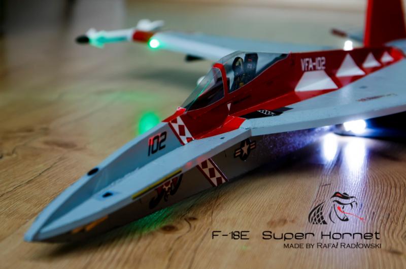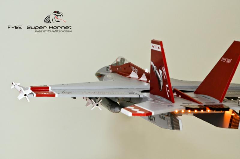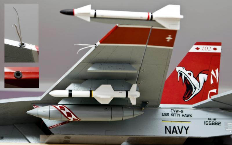W sprawie uzbrojenia - bardzo szybko i dokładnie zrobisz rakiety z balsy - korpus z gotowego odcinka okrągłej balsy, stateczniki też z balsy klejone na super glu=około 30min pracyna 2 szt, potem pomalowanie i paski kolorowe z naklejki - konstrukcja głatka, bardzo lekka i sztywna, !. A jak chcesz mieć zbiorniki paliwa to metodą na "małego modelarza" - tu trochę więcej czasu trzeba poświęcić - wręgi z depronu , korpus z kartki bloku technicznego+malowanie. A efekt jak w moim F-18: