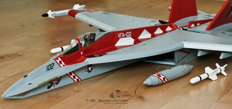 I to już ostatni etap udoskonalania F-18 - zbiorniki paliwa i uzbrojenie (zbiorniki zrobione metodą z modeli kartonowych - wręgi z depronu, poszycie z tektury a rakiety z balsy) - imitacja działka na dziobie, nowe dysze silnika (z boku także zrobione), numer boczny VFA-102, napisy i oznaczenia eksploatacyjne na górze i od spodu Rakiety będą podwieszone na stałe a zbiorniki paliwa przyczepiane do pylonów na magnesy neodymowe w celu ich łatwego demontażu ze względu na dostęp do serwomechanizmów. Na tym koniec zabawy. W oczekiwaniu na oblot - misja z uzbrojeniem. W tym miejscu post pora kończyć That's all folks -