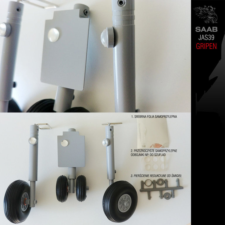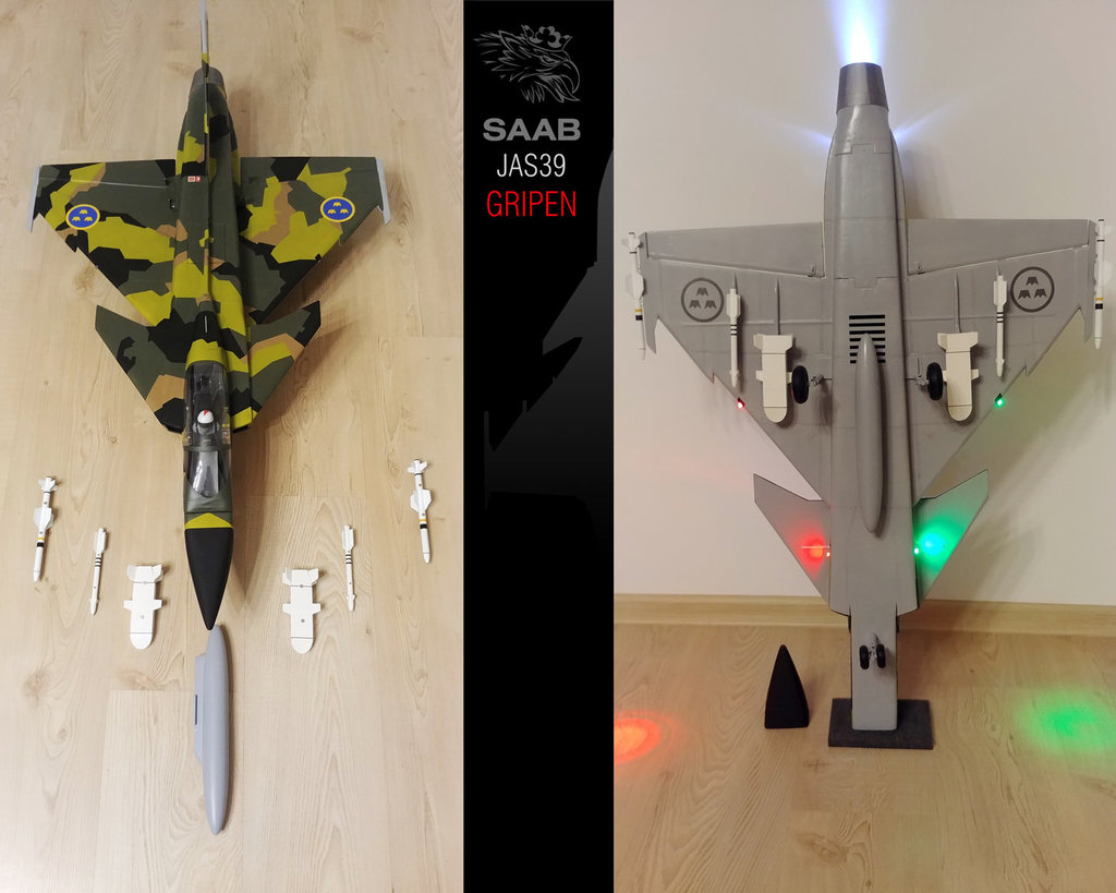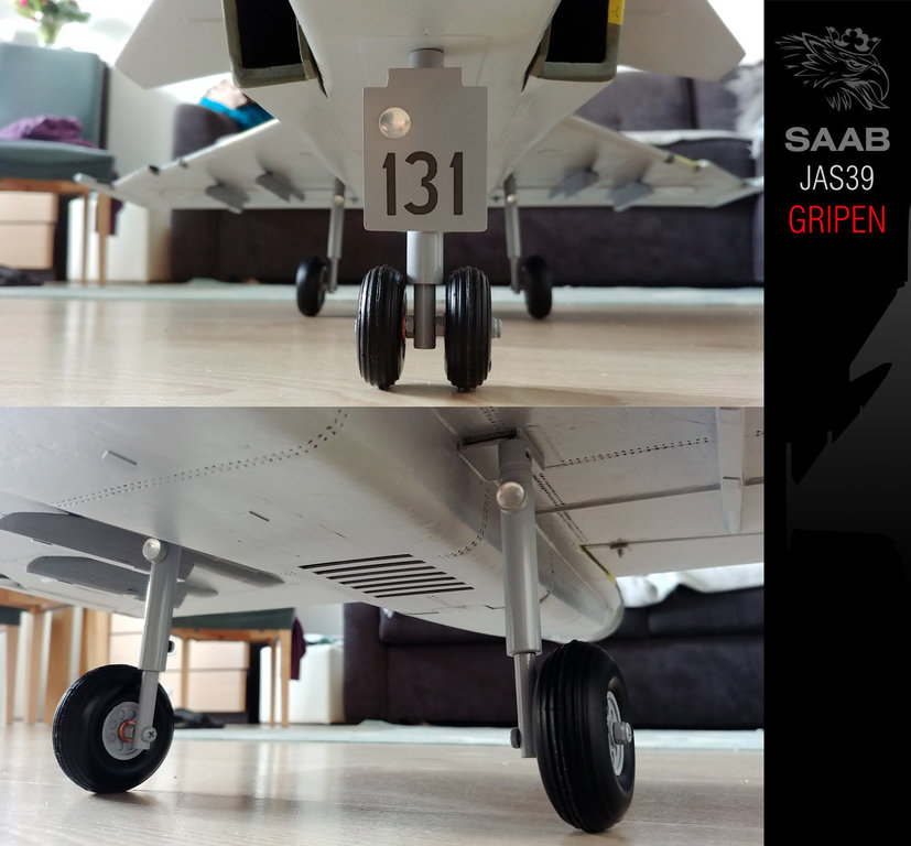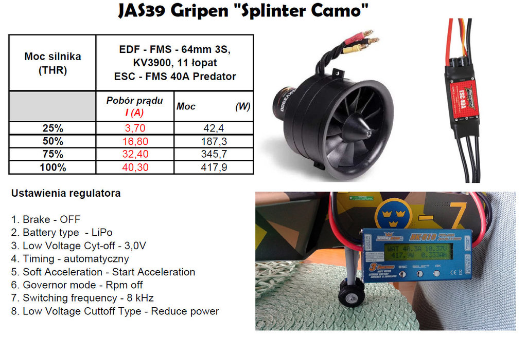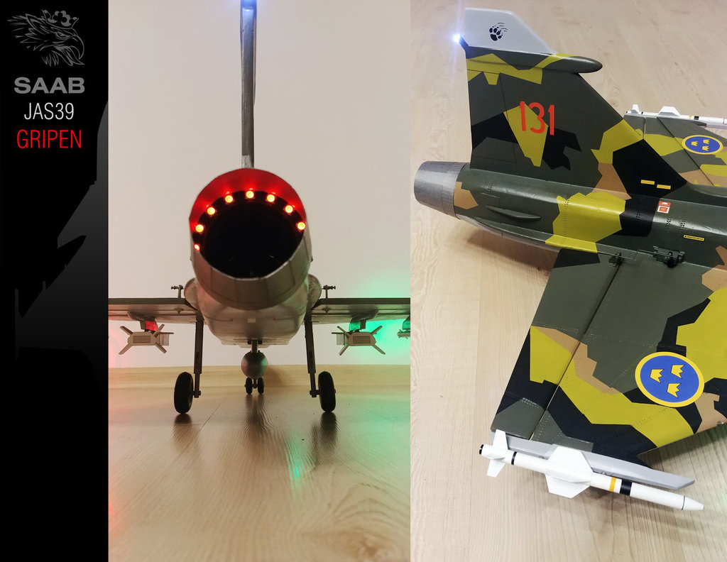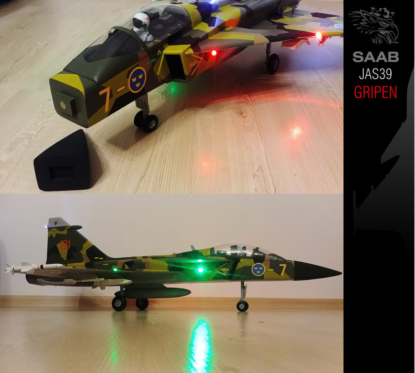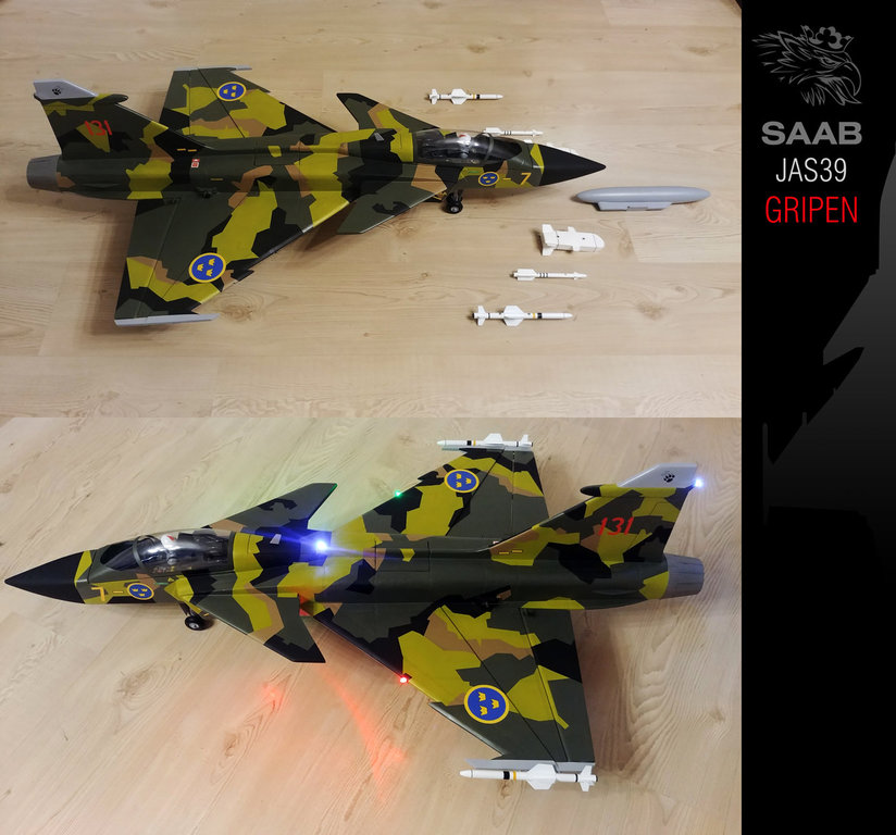 JAS39 Gripen EDF Jet, malowanie „Splinter Camo” Długość 111 cm Rozpiętość skrzydeł 67 cm Skala 1:13 Bez podwozia Wysokość 26 cm Waga modelu do lotu (RTF): 950 g "Ciąg" mierzony na wadze 650g Powierzchnia skrzydeł 14 dm2, obciążenie przy max. wadze 950g wynosi 67,85 g/dm2 Powierzchnia skrzydeł z powierzchnią canardów 16,4 dm2, obciążenie przy max. wadze 950g wynosi 57,92 g/dm2 Z podwoziem Wysokość 35 cm Waga modelu do lotu (RTF): 1040 g "Ciąg" mierzony na wadze 650g Powierzchnia skrzydeł 14 dm2, obciążenie przy max. wadze 1040g wynosi 74,28 g/dm2 Powierzchnia skrzydeł z powierzchnią canardów 16,4 dm2, obciążenie przy max. wadze 1040g wynosi 63,41 g/dm2 Wyposażenie: Silnik i turbina: FMS EDF 64mm, 11 łopat, silnik 2840-KV3900 , zasilanie 3s, ciąg 900g ESC: 50A, BEC 5A, Skywalker 1. Brake - OFF 2. Battery type - LiPo 3. Low Voltage Cutoff – medium 3,25V 4. Start mode - Normal 5. Low Voltage Cuttoff Type - Reduce power 6. Timing - Low Servo: 2 x 9g Towe Pro SG92R Li-pol: 2300mah 11.1V 3S, 45C, Tattu Komplet oświetlenia - 1 x stroboskop, 4 x pozycyjne(na skrzydłach i pod canardami), 1 x pozycyjne na ogonie podłączone pod kanał nadajnika (5,5V), imitacja dopalacza(pierścień LED) podłączona przez sterownik Arduino pod kanał odbiornika THR. Pylony pod skrzydłami+rakiety i zasobniki do walki elektronicznej na magnesach neodymowych Historia modelu - loty i przeróbki autorskie