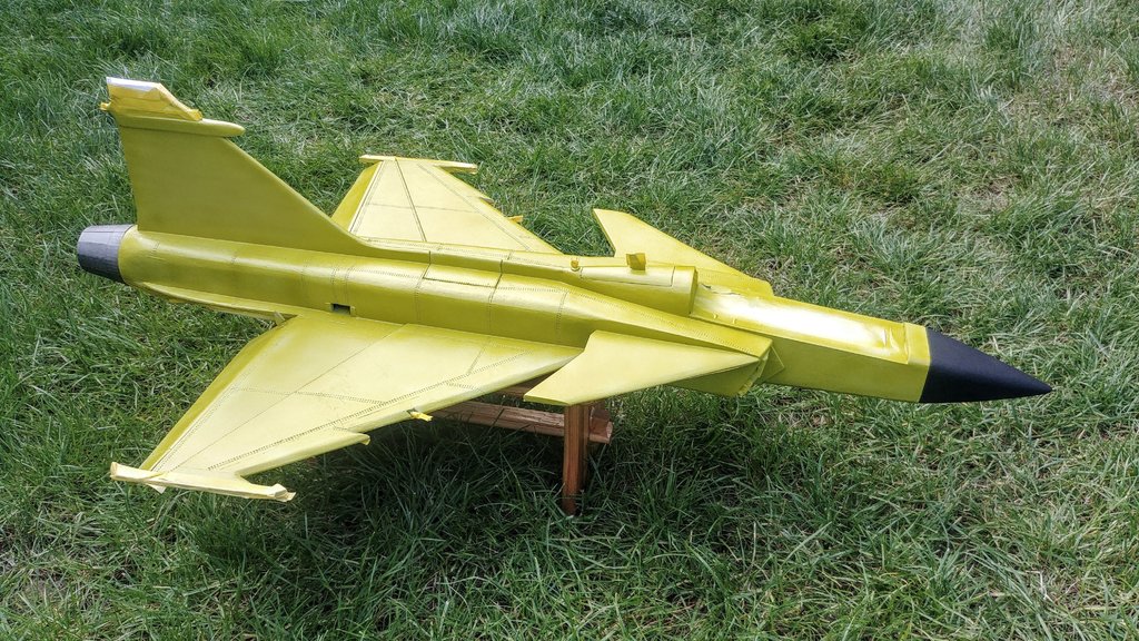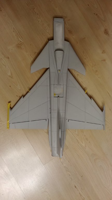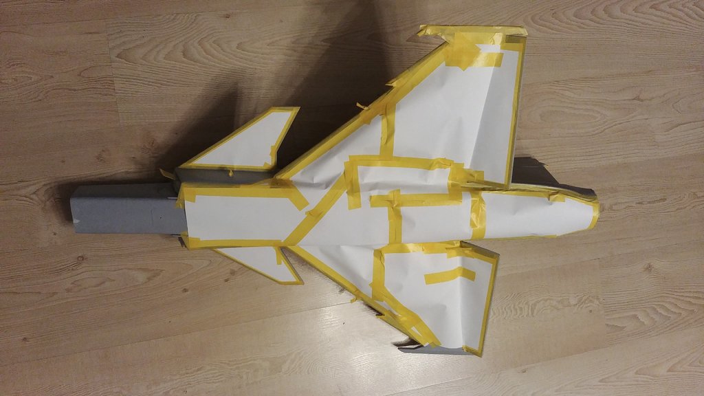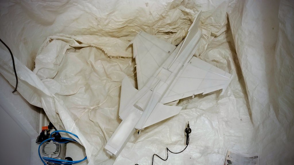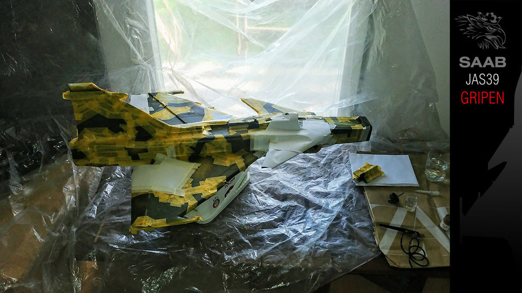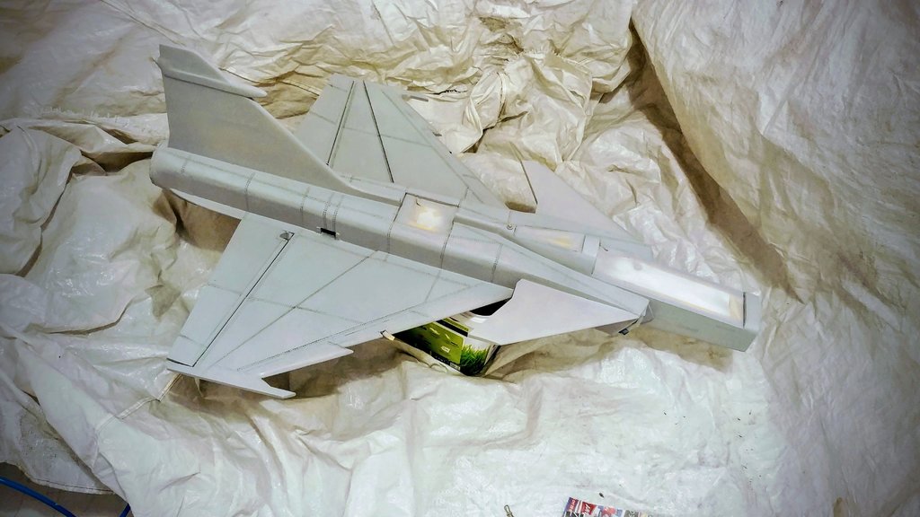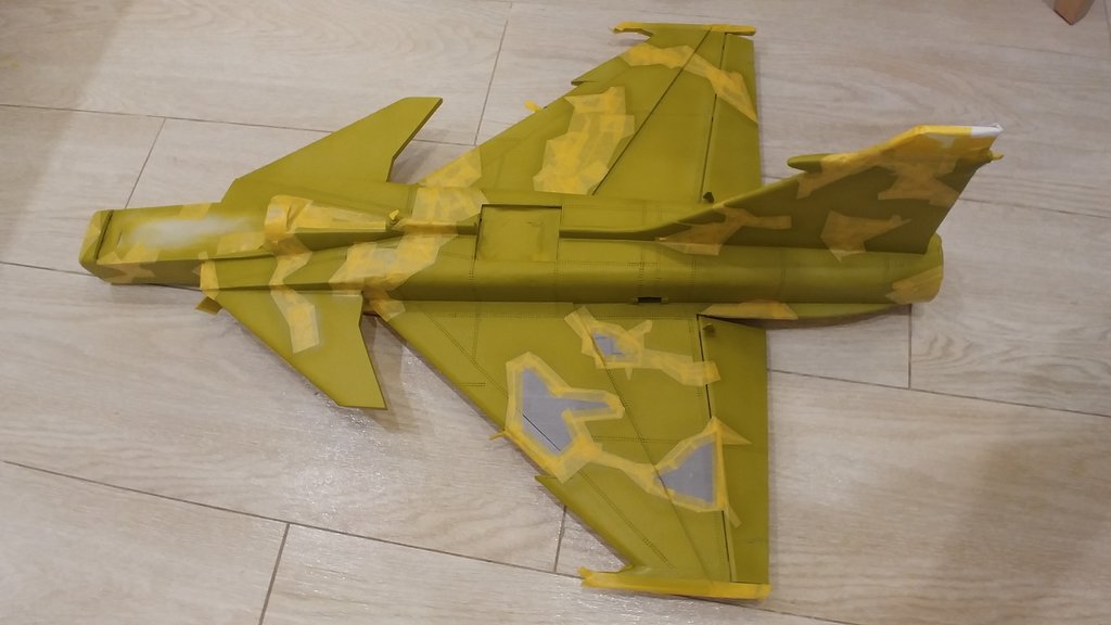 Trzymajcie kciuki. Malowanie rozpoczęte. Całościowo podkład jasnoszary i bazowy szary od spodu już jest. Teraz maskowanie spodu i od góry będzie kamuflaż typu "splinter camo". Szablon naklejek też gotowy - będę drukował i naklejał jak w modelach plastikowych. Szału nie będzie bo to model po przejściach, odrestaurowany, szpachlowany, szlifowany, przerobiony z napędu śmigłowego pchającego na EDF. A do tego z depronu więc wszystkie ryski i wgniotki będą wcześniej czy później widoczne. Ale oko będzie cieszyć :-). Coś trzeba przecież podłubać wieczorami. -