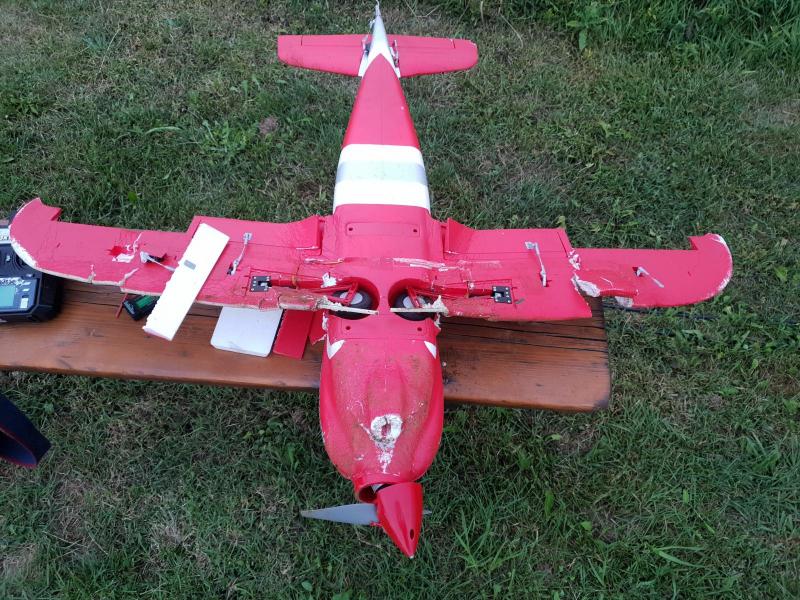Gdzieś kiedyś widziałem skrzydło do kupienia, kadłub do odratowania, silnik kręci tylko ta ośka na przodzie wygięta, ale ona dokręcana na 4 imbusy, to pewnie też idzie dostać Lipo lekko dostało, jedna cela leciuteńko wbita na samym końcu, będzie żyć no i plus że przy tak silnym walnięciu aż bateria się odłaczyła. Nie wiem jakim cudem bo napewno nie przez pociągnięcie przez baterię, ona sama solidnie przyczepiona tylko przesuneła się o 1cm . Ale dzięki temu pewnie regulator cały bo silnik momentalnie przestał działać. Nie wiem jeszcze co z odbiornikiem, jutro zrobię przegląd, plus tego że antenki były luźno to ich nie wyrwało. Ale siła była taka że mogło je naderwać. Jutro się okaże. Swoją drogą ciekawe jak by to wyglądało jak by wbił się bezpośrednio w ziemię, bo tak to miał "MIĘKKIE" lądowanie w polu