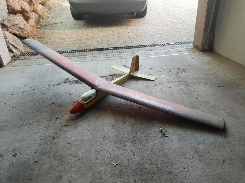 Niestety dziś nie dałem rady oblatać. Przed chwilą skończyłem przygotowania, i jak Piotr napisał na chwilę obecną dałem spokój z lotkami, może kiedyś o ile coś to poleci. Gotowy do lotu wyszło 1060g jak na rozpiętość 1,8m nie wiem czy to mało czy dużo, pewnie sporo bo jakąś starą technologią robiony. Kadłub na pierwszy rzut oka wygląda jak laminat, ale w pęknięty miejscu widziałem jak by plastik to był.