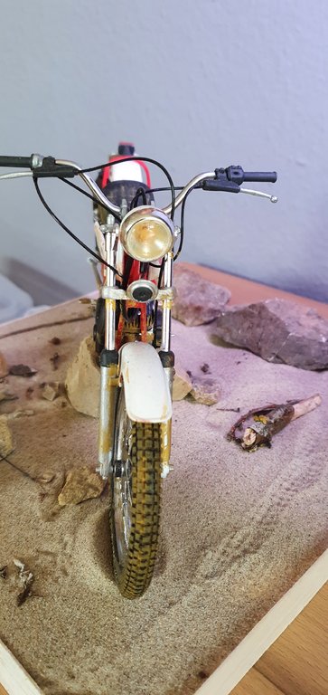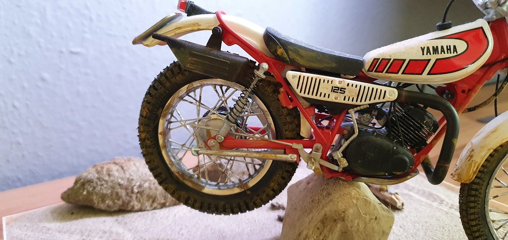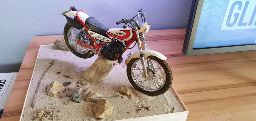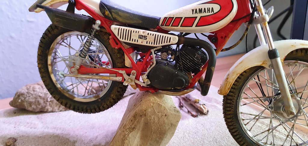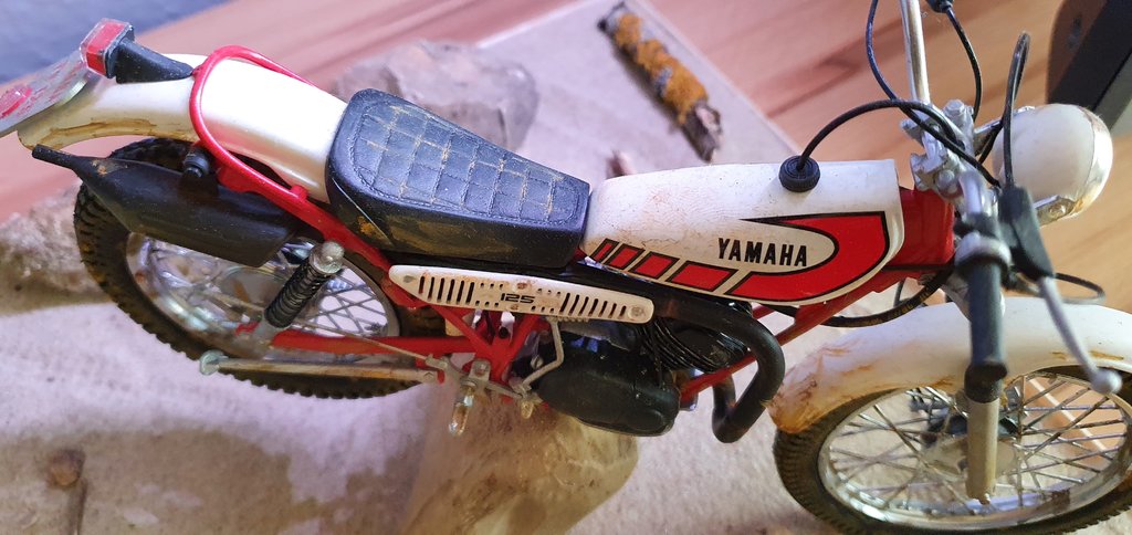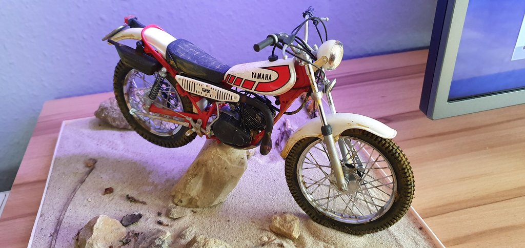 To się pochwale, a co mi tam ostatnio złożyłem taki oto modelik firmy Heller w skali 1/8. Yamaha TY 125. Dawno nie robiłem plastikowych modeli i po raz pierwszy "brudziłem" model i postawka też pierwsza bedę chyba piasek zmieniać na troche ciemniejszy ale i tak jest dobrze.