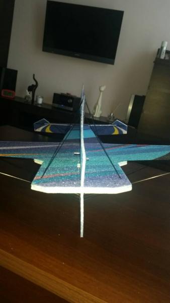 12. Witam. Po dłuższej przerwie czas trochę nadrobić.Dysponując 2 dniami wolnymi od pracy, zabrałem się za sklejania. Na początek sklejanie tylnej części kadłuba (poziomej) z płatem. Kolejną czynnością było wklejenie dolnej części kadłuba. Po tym zabiegu, nadszedł czas na wykrzyżowanie całego spodu. Począwszy od steru wysokości zakończone na płacie. Dodam tylko że "węgiel" był już w zestawie. Przycięty na odpowiednie długości. Ale jak by tego było mało, znalazłem również miejsca z gotowymi otworami w których należało je osadzić. I czas na górę. Niestety pojawił się problem. Górna część kadłuba ( w przeciwieństwie do dolnej ) nie miała usztywnienia w postaci przyklejonego płaskownika węglowego. Co skutecznie uniemożliwiło dalsze prace. Producent zawarł w zestawie takie oto kawałki depronu, którymi według załączonej instrukcji mamy doprowadzić kadłub do " normalności " poprzez wklejenie tego w taki sposób Stwierdziłem że zbyt wiele przy tym roboty, i na górę wkleiłem płaskownik 3 mm o gr. 0.5 mm co dało mi sztywność górnej części, a następnie wkleiłem dodatkowo 6 prętów węglowych dla usztywnienia całości. I w sumie z wyników jestem zadowolony. Jest jeszcze jedna zmiana której dokonałem. Mianowicie chodzi o ogon. A dokładniej o wykrzyżowanie steru wysokości ze statecznikiem pionowym w dolnej części. Producent założył inaczej. Ja zrobiłem po swojemu. Chciałem uniknąć ograniczeń przy wychalaniu się statecznika poziomego. Dlatego też nie zastosowałem tak jak radzi producent aby wkleić pręt do samego końca ponieważ powierzchnia sterowa mogła by mieć ograniczenia w wychylaniu się.Pręt został przesunięty o około 3 cm do przodu co dało pełen zakres ruchowy. Podsumowując. Model świetnie wykonany. Wszystko pasuje do siebie idealnie. Szkoda tylko że już tej firmy najprawdopodobniej nie ma na rynku.. A i pewnie chcieli byście wiedzieć ile to waży. To co na zdjęciu to jedynie 57 gram. Do wklejenia pozostał tylko ster kierunku. C.d.n. Wysłane z mojego SM-G900F przy użyciu Tapatalka