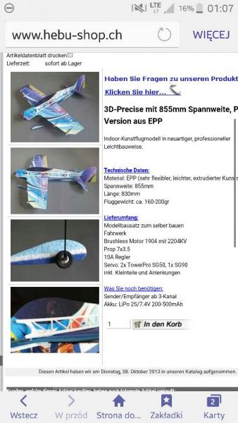 9. Możliwe. Żona kończyła filologię polską. Ja nie [emoji12] ale potocznie się wyraziłem. Mimo to dziękuję za zwrócenie uwagi. Serwa 3,7 g. Silnik no name ale z uzyskanych wiadomości wynika że ma około 2200 kV. Regulator dualsky 6 lub 9 A. Zobaczymy czy serwa nie będą za słabe.. producent przewidział 5 gramowe. Specyfikacja znaleziona w necie. Wysłane z mojego SM-G900F przy użyciu Tapatalka