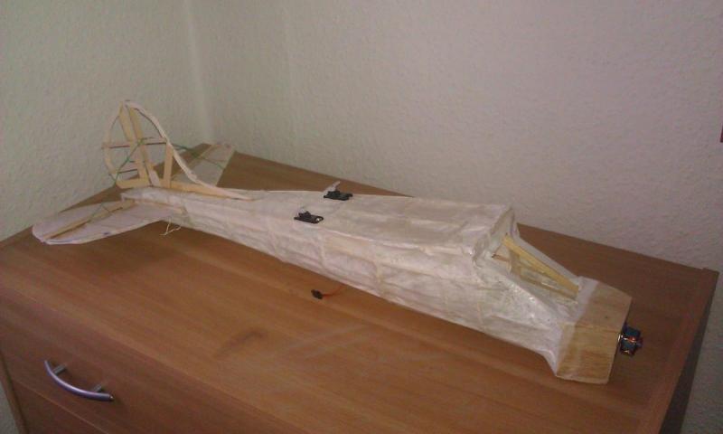 Dzisiaj przyszły jeszcze dwa 9 gramowe serwa, więc myślę, że może okleję dzisiaj skrzydła. Zostanie podwozie i można latać . Oklejony kadłub ze statecznikami (nieoklejony pionowy) - 160 gramów.