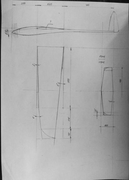 3. Witam. Jakiś czas temu naszkicowałem sobie taki oto wstępny projekt, który to szkic przerysowywać zacząłem na komputerze. Założenia- latanie rekreacyjne, czyli trochę termiki i podstawowe akrobacje. Będzie to w zasadzie klonem Guppy'ego jeśli chodzi o konstrukcję kadłuba- obudowanie rurki balsą. Profil puki co przewiduję AG-24 na skrzydła i CRD (co ręka dała) symetryczny na stateczniki. Jedna rzecz, jaka mnie zastanawia i trochę niepokoi to poziom statecznika i skrzydeł- nie wiem, czy ich płaszczyzny nie są zbyt blisko siebie? W większości szybowców poziomy statecznik jest umiejscowiony w połowie pionowego, lub w układzie T. Jakbyście mieli jakieś sugestie/uwagi , to chętnie przyjmę. Na etapie projektowania jeszcze się da wprowadzać zmiany, później jest już coraz trudniej Co do lotek na przykład nie mam pewności- może po 30-40 cm, a reszta to klapy, może klapolotki jak w DLG, może lotki i klapy "krokodyle" ? Na razie tyle ode mnie. Być może niedługo skończę plany ,które na pewno nie będą dokładnie wszystkiego narzucać. Znajdą się w nich obrysy, rozmieszczenie żeber, dźwigarów, kesonów, szablony , umiejscowienie rurki fi6 w kadłubie, kilka wręg. Udostępnię to wszystko jeszcze przed budową, także dam się wyprzedzić, o ile ktoś się podejmie budowy. *Belkę ogonową przedłużę bo widzę teraz, że wygląda to dobrze tylko na rysunku.