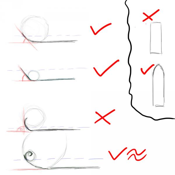 14. Mnie się wydaje, ze jest za ciężki iprzez co obciążenie powierzchni nart jest za duże. Poza tym Styczna wygięcia czubka narty powinna być pod kątem 45 do 50 stopni. U ciebie najbardziej wysunięta część ma styczną pod kątem prostym . Popatrz, jak kształt wygięcia wpływa na maksymalny poziom sniegu, w jaki można spokojnie wjechać. Ponad to narta bez ozdobników może się jeszcze wspinać, gdy niebieska linia bedzie ponad jej czubkiem, na tej samej zasadzie, co canard podniesiony do góry. Ale nie jest potrzebna cała szerokość narty, dla tego się ją scina.