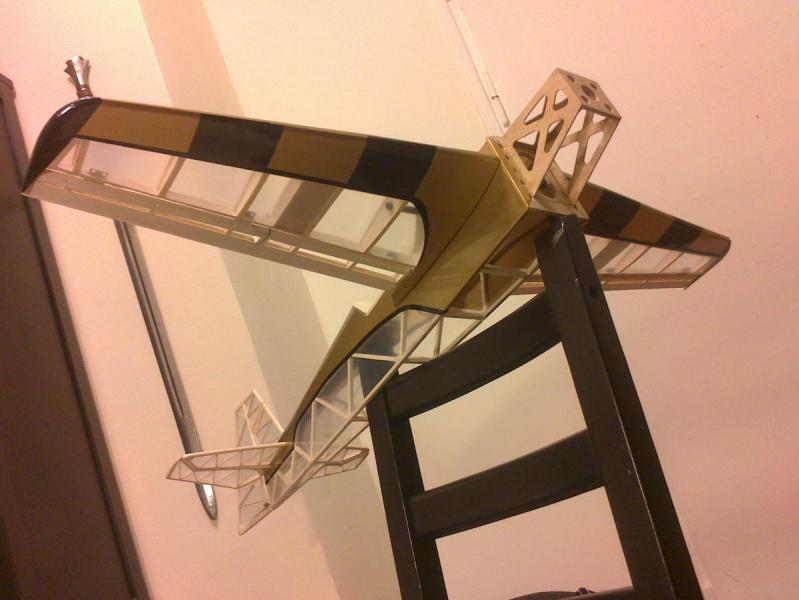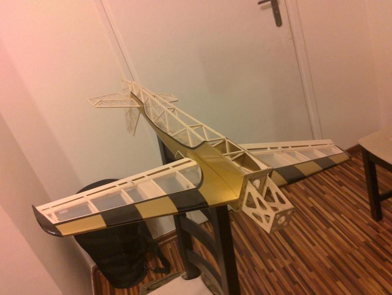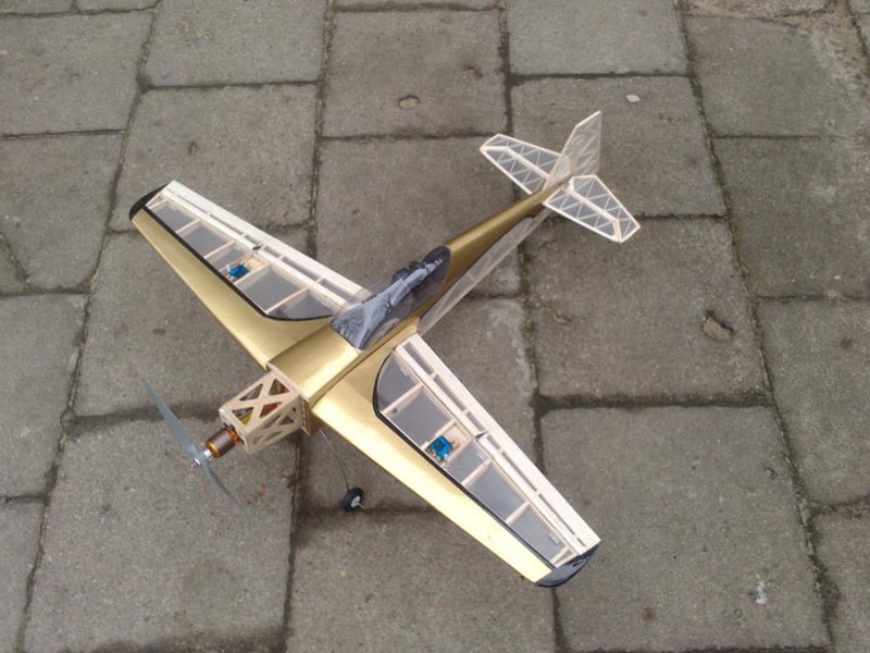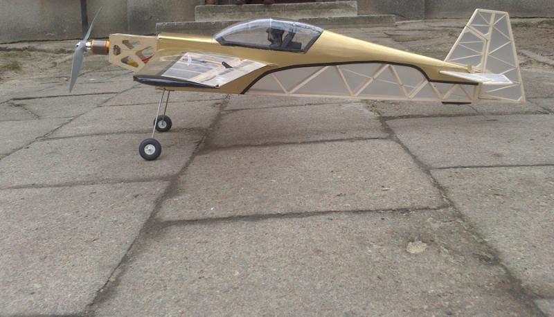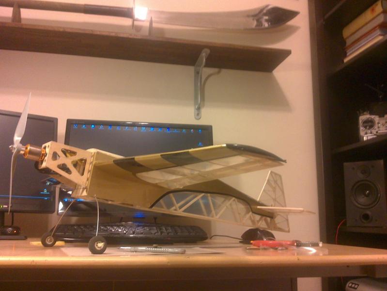 10. Dzisiaj na warsztat poszło podwozie , oklejanie lotek, które wczoraj wreszcie doczekały się dźwigienek oraz rozmyślania rozmieszczenia elektroniki , klapek, drzwiczek, mocowań maski (czyli planowanie rzeczy, których nie lubię robić). W tym stanie waży 629g (z całą elektroniką i elektryką,w tym aku 3s 1,8 Ah). Zakładając, że masa dobije do 700g (a pewnie i tak przekroczy) to obciążenie skrzydeł (statecznika nie liczę, bo płaski) wyniesie 57 lub więcej g/dm^2.