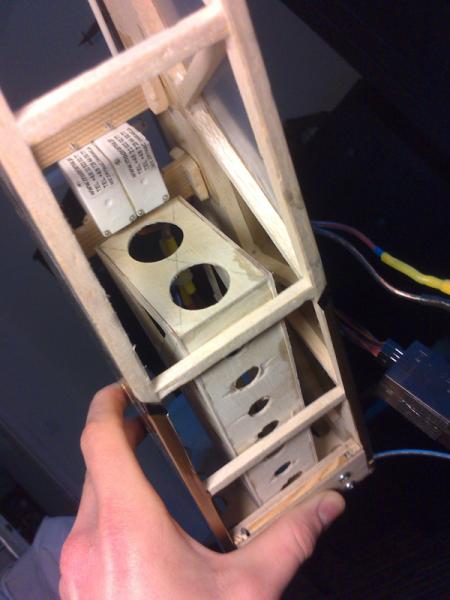 6. Umocniłem skrzynkę, jednak nie tylko sklejką, ale i balsą. Do tego doszła płoza ogonowa. Uciekły mi otwory- taki materiał wredny ze starej piły. Sprężysty, ale jak się go przegnie, to pęka bez ostrzeżenia, ale i tak błyskotka niebrzydko wygląda na żywo . Pomoże ona też w wymuszeniu umiejscowienia akku z przodu skrzynki( oby nie za bardzo)- odpadnie wtedy problem zabezpieczenia go od góry.