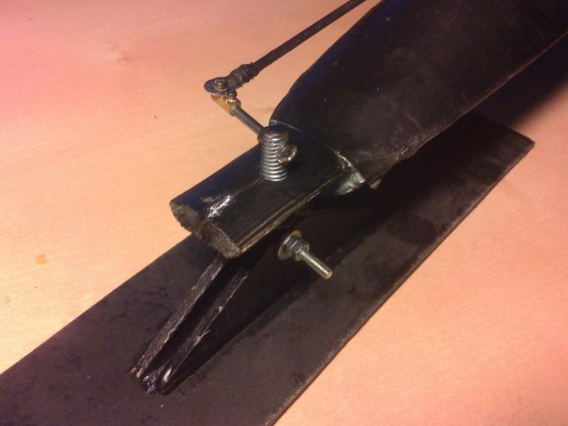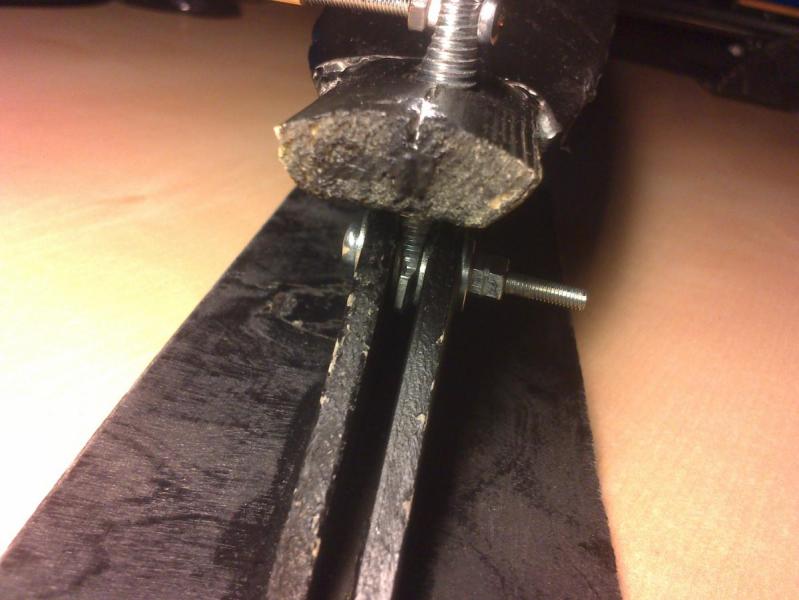 6. Wrzucam jeszcze film, jak wygląda w nieco lepszym świetle + mała konkluzja na koniec. -Projekt można uznać za udany- nie okazał się konkretną klapą. Pojazd jeździ po głębokim śniegu, z górki, pod górkę i po głębokim i po ubitym (kawałek dalej była górka o nachylaniu 45* -wjechał i zjechał bez zbędnych ceregieli po ubitym i nieubitym) . Po nieubitym zarzuca tyłem i przedniej nartce przydałby się wypust kierunkowy. Przyciąga uwagę, jak mało co http://www.youtube.com/watch?v=MZAu9v1iU_Q&feature=youtu.be -Szybkość. Rakieta. Kilka kraks już miał, przez co się lekko pokrzywił i silnik dostał lekkiego skłonu co powoduje problemy z utrzymaniem prostej na pełnym gazie. Dla tego nie szalałem. -Ogólne podsumowanie. Koncepcja jest na prawdę fajna, Trzeba by zrobić coś takiego na spokojnie po wcześniejszym dokładnym zaplanowaniu ,a na pewno odwdzięczy się dostarczając masę świetnej zabawy. -Co bym zmienił? +kilka rad: Punkty narażone na uszkodzenia to: miejsca styku płóz z trójkątami mocującymi (tył), łoże silnika- przy wywrotkach, łączenie ramy- musi być na prawdę pancerne. Gdybym brał się jeszcze raz za ten projekt,Być może zamiast ramy w kształcie "T" zrobiłbym coś bardziej na kształt obrysu promu kosmicznego, ze wzniosem ujemnym tak, żeby z wieżyczką rama utworzyła znaczek mercedesa. Rozstaw tylnych nart- większy, a ich kztałt jednak bardziej pływakowaty \_/ o kącie ścianek około 30* od poziomu + na górze nartki daszek /\ ,żeby śnieg tak nie zalegał.Układ sterowania- tu będzie zawsze problem- ja zrobiłem ze śruby M8 , zeszlifowałem łeb , zostawiając kształt "t" ściśnięty lekko między trójkątami mocującymi (obowiązkowo podkładki pomiędzy !). Jeszcze kilka zbliżeń zastosowanych przeze mnie rozwiązań: FPV- szkoda mi telefonu