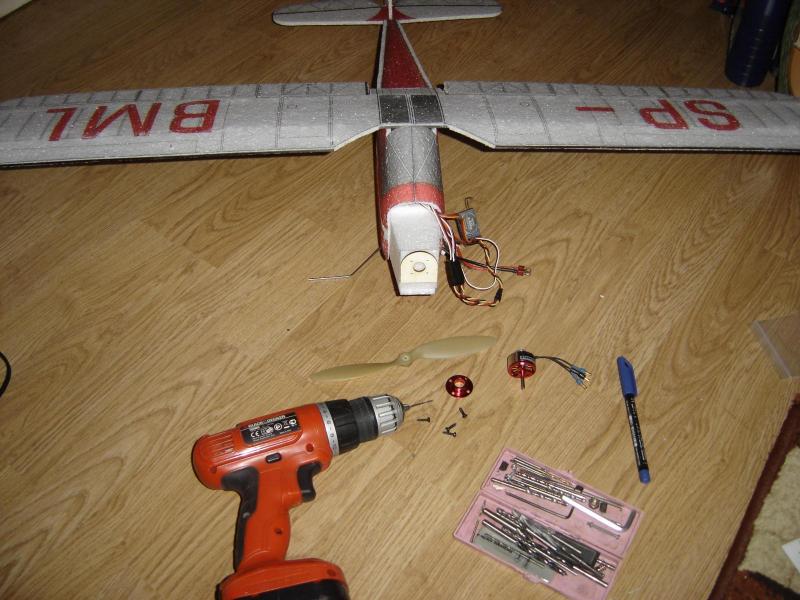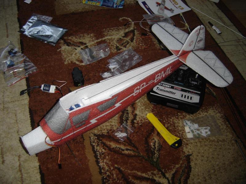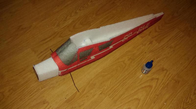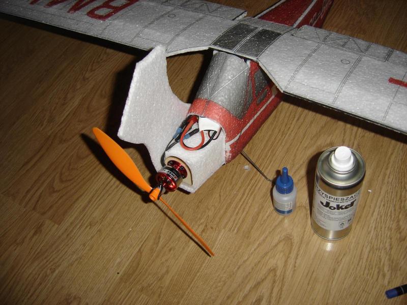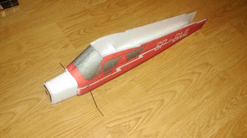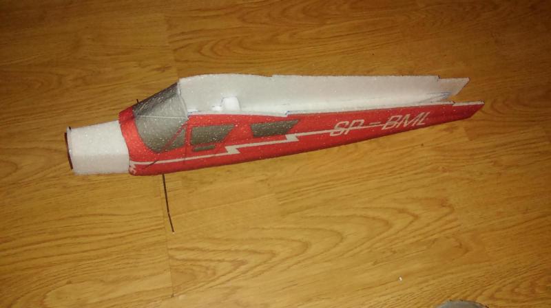 RWD13 zestaw pomysłu i produkcji Marka nabyłem jakiś czas temu, po dwóch miesiącach, przystąpiłem do montażu. Zajęło mi to zadanie około 3dni, po pracy po ok 3 godzinki, czyli wolna sobota, a w niedziele można robić oblot. RWD13 (EPP) : rozpiętość 1000mm, waga do oblotu ok 330 gram (uważam to za dobrą wagę dla tego modelu, nie chciałbym by był lżejszy:) silnik Emax CF2822 (troszkę niby za duży i za ciężki, ale innego nie chcę w tym modelu) regulator Redox 30A( taki miałem, waży prawie tyle co pakiet) (39gram) pakiet Redox 2S 7.4V 700mah 20C (37gram) piasta prop saver i śmigło 8x6 SF serwa w kadłubie, ster wysokości Turnigy 9 gram, ster kierunku Tower Pro 9 gram, lotki 2 x Tower Pro SG 51R 6gram. Montaż jest szybki, początkowo kleiłem go klejem Dragon polimerowy 250ml (ok 5zł), i klejem Dragon CA (póki przyszła przesyłka z CA joker i przyśpieszaczem, zużyłem chyba 5 opakowań po 2ml) bo skończył mi się klej CA joker. Jako przyśpieszacz używałem wody z sodą, plus atomizer od jakiegoś leku. Kadłub poszedł momentalnie, wklejenie steru kierunku i wysokości także, tu uwaga, ja nie radzę jak w instrukcji smarować klejem steru kierunku by go wzmocnić, albo zostawiamy jak jest, albo rozcinamy i wklejamy dwa gotowe kupione zawiasy nylonowe, ewentualnie robimy je z dyskietki komputerowej. Ja jako mocowania bowdenów dawałem „baryłki” na imbus. Nakrętki zabezpieczyłem klejem polimerowym (opcja dla Loctite) . Kable od serw wypuszczamy na przód kadłuba. Po sklejeniu kadłuba (ale to było szybkie i proste nawet dla laika jak Ja), przychodzi czas na skrzydła, samo nacinanie i wklejanie wzmocnień z płaskowników węglowych poszło sprawnie i szybko, oczywiście tylko i wyłącznie klej CA plus przyśpieszacz. Następnie wklejanie żeber, pierw od strony lotek, a później od strony natarcia, można użyć spinaczy do prania, a raczej suszenia prania . Ja lotki zrobiłem wg (przynajmniej) mnie najlepszym rozwiązaniem, czyli dwa serwa, krótki popychacz i mocowanie popychacza (bowdena) baryłka z imbusem. Lekkie serwa, przyklejone zarówno do pianki skrzydła jak dolną ich częścią do żebra. Przed przyklejeniem żeber należy powiększyć otwory w żebrach by kabel serw mógł bez problemu przejść. Mając skrzydło całe, wklejamy je, ja pierw do kadłuba wkleiłem element oryginalnego napędu lotek, robiac w nim dwa otwory na przewody od serw lotek. Wklejony element usztywnia górę kadłuba. Wklejamy skrzydło, pierw patrząc, czy ma ten sam wznios z prawej i lewej strony. Kable od serw wypuszczamy na przód kadłuba. Po wklejeniu, montujemy zastrzały z włókien węglowych, odcinamy je z zapasem długości wklejamy w otwory środkowego żebra i w kadłubie( miejsce wklejenia to taka kropka ), uwaga by nie zwichrować skrzydła, także dajemy klej na górze przy żebrach, a dół, pierw regulacja wzniosu i natarcia prawej i lewej połówki skrzydła i gdy już jest równo aplikujemy CA i lecimy przyśpieszaczem. Ja zrobiłem sobie osłonki zastrzałów z plastikowych rurek, coś ala słomki( nie wiem skąd je mam i od czego były, czyżby prezent po zakrapianej imprezie:)). Zostaje przykręcenie silnika na wkręty, dajemy na górze podkładki (plastikowe metalowe), by zrobić skłon i wykłon, ja do tego ile ich dać użyłem aplikacji w komórce „poziomica” ok 4,5 stopnia w dół i 2 w prawo. Przykręcamy silnik, dokładamy regulator, odbiornik, podpinamy wyprowadzone kable od wszystkich serw ( wiadomo do lotek użyłem kabla Y więc z lotek jest jeden kabel). I zostaje, przykleić maskę z jednej strony, a z drugiej wkleić patentny rzep . Oczywiście by się ładnie zasklepiło robimy opisane podcięcia (instrukcja marka). Pozostaje wyważenie modelu!. U mnie SC mam ustawiony na 45 mm od natarcia i nie tykam już tego . Do podstawowego podwozia robimy, ozdobne( bo nie dla wzmocnienia) amortyzatory i drążki podłużne. Wykonałem tylne kółko z pręcików bodajże 0,8mm dołączonych do zestawu (waga kółka i drucików ok 2,5 -3grama). Model po wyważeniu, gotowy do lotu. Bardzo prosty do wykonania i co się okazuje, fajnie latający model. Polecam . Zdjęcia po kolei z budowy tego cuda;). Sorki, ale ten model mnie cieszy Jedno serwo się uszkodziło, zrobiło kilka machnięć i zaczeło drżeć, dobrze kupiłem 3 sztuki.. A tu link do dzisiejszego oblotu (HD) Po regulacji steru wysokości, model lata jak talala, nic już w nim nie reguluję, tylko latać.