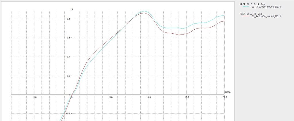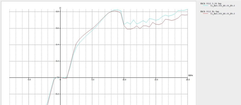 Patryk, Dead band oczywiscie istnieje ale to co Ty pokazales jest "troche" przesada (blad numeryczny). (Airfoils at Low Speeds) Wynika to z faktu, ze uzyles Ncr=9 i zapewne masz 0 (Zero) grubosc krawedzi splywu. Ncr=9 jest zbyt optymistyczne i 6 lub 7 jest bardziej realistyczne ("Designing flying wings", Peter Wick). Jesli uzywa sie zerowej grubosci krawedzi splywu program uzywa zupelnie innych rownan (warunkow brzegowych??); to jest info od Prof K. Kubrynski. Zwroc uwage, ze dla 0.1% gap i Ncr=6 program przewiduje zachowanie profilu w tym zakresie praktycznie dokladnie. Wprawdzie jest to N0010 a nie N0009 ale nie chcialo mi sie robic tego 2 razy; dzisiaj jest Piatek i musze wkrotce kosic trawe a potem wypic piwo z sasiadem 😁 a potem jeszcze isc na rower.