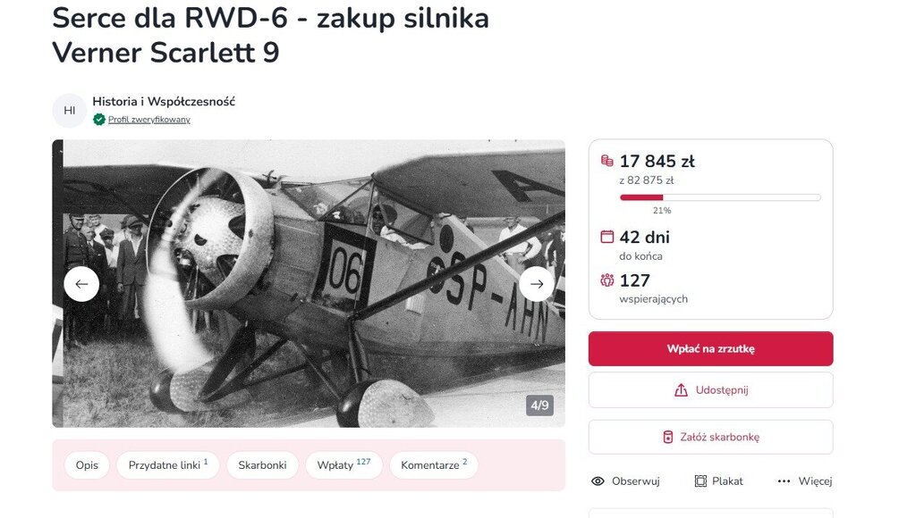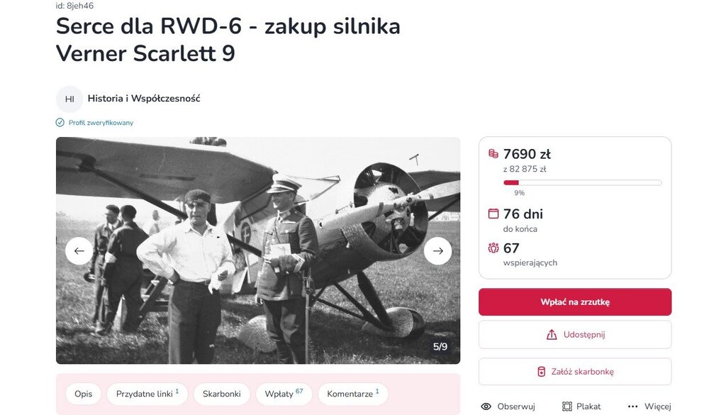 Koledzy, Jeszcze raz ja o tym samym. Musze przyznac, ze troche sie ruszylo i w ciagu miesiaca uzbierano ponad 10000zl i liczba sponsorow powiekszyla sie z 67 na 127. Czyli srednio te ostanie 60 osob dalo po ~167zl. Najwiecej ktos dal 3500zl a jeden hojny nawet 1zl! https://dlapilota.pl/wiadomosci/polska/serce-dla-rwd-6-zbiorka-na-polmetku Ale potrzeba "troche" wiecej, w tej chwili jest to dopiero 1/5 potrzebnej kwoty. Jest juz nowa strona o odbudowie zwycieskiego samolotu Zwirko i Wigury: https://zbudujmyrazemrwd6.pl/