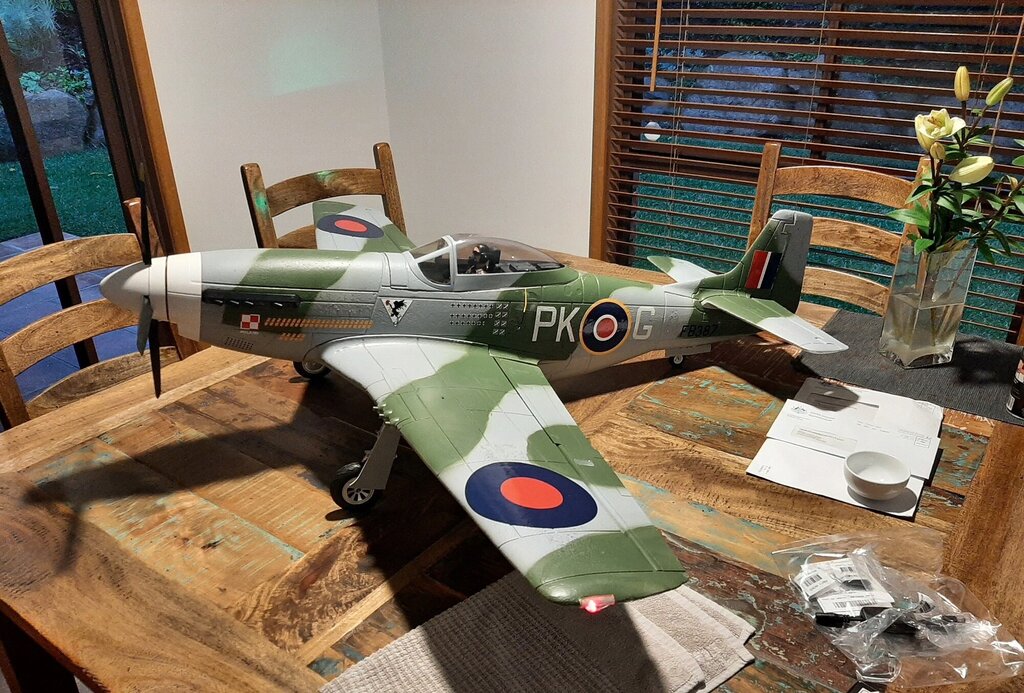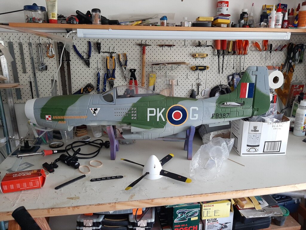 W Piatek chcialem oblatac mojego przemalowanego FMS Mustang IV. Przemalowalem go na ekstrapolowanego PK-G E. Horbaczewski. Dodalem mu kilka zestrzelen. Niestety lot trwal 3s. Tuz po startcie model przewrocil sie na plecy i zrobil niezla dziure w ziemi. Wydaje mi sie, ze powodem bylo wadliwe servo jednej klapy, ktora czasami sama opadala, nie powininem byl startowac bez wymiany serwa. Teraz bede mial duzo zapasowych serv ?.
