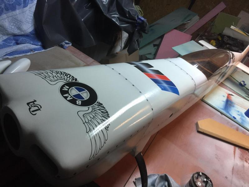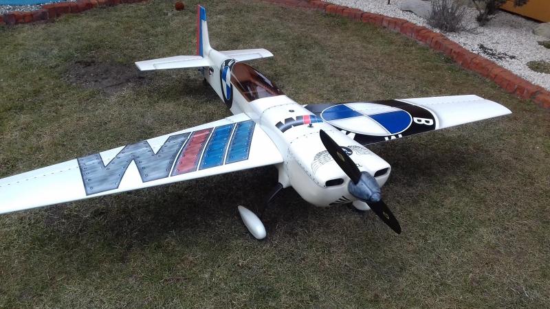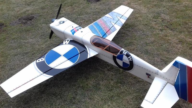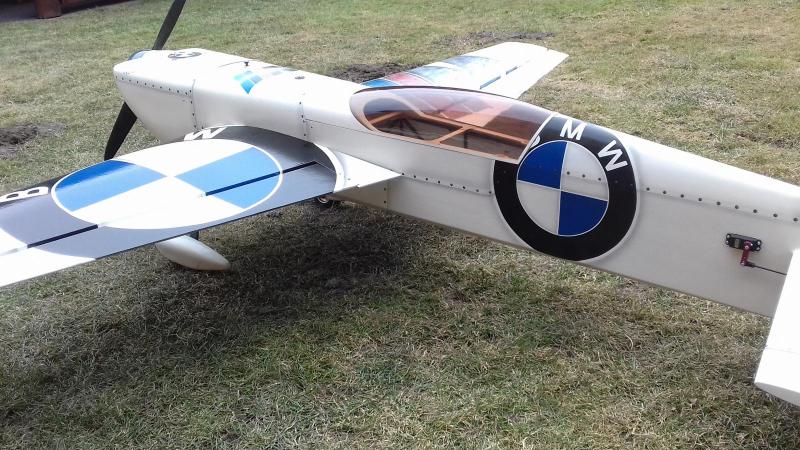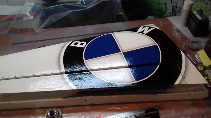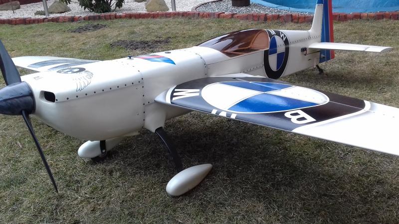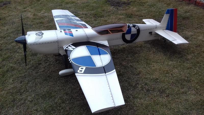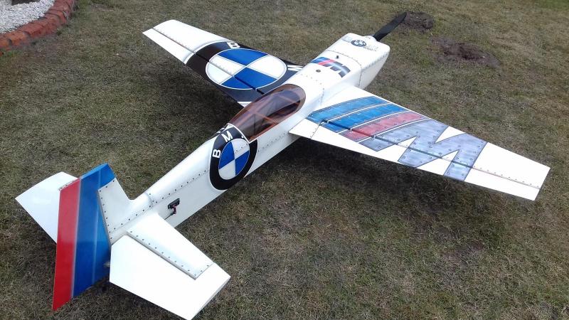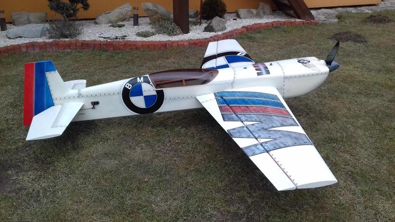 Bogdan wpadnę do was na lotnisko to będziesz mógł focić do woli, a co do kabiny, to faktycznie jest bardziej z tyłu. Gotowy model do lotu, nie mam pojęcia ile będzie ważył, podam wagę na końcu, a co do malowania to np. logo BMW czy M pakiet wyklejam taśmą malarską obrys i maluje, nity robię przykładając szablon, a reszta to już od ręki, cienie, przetarcia itd. -