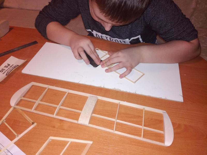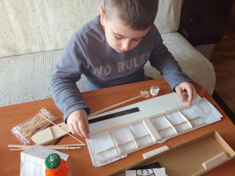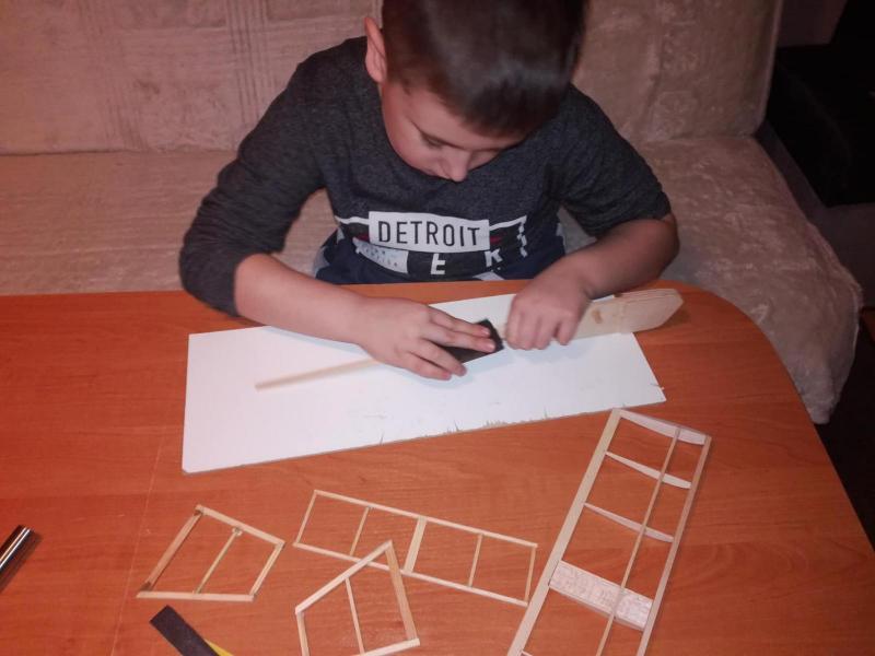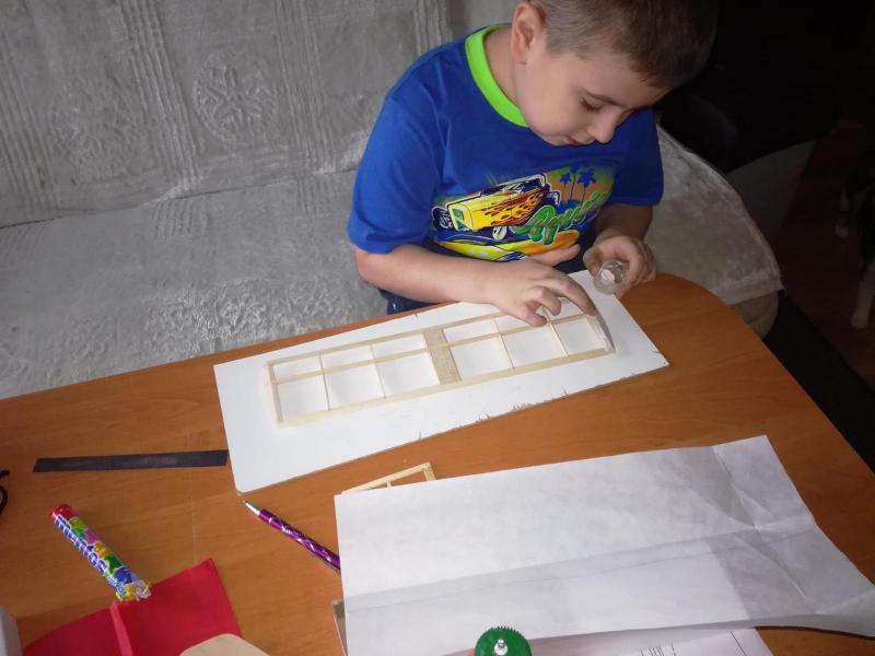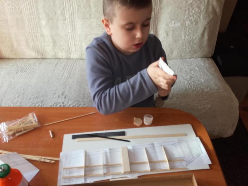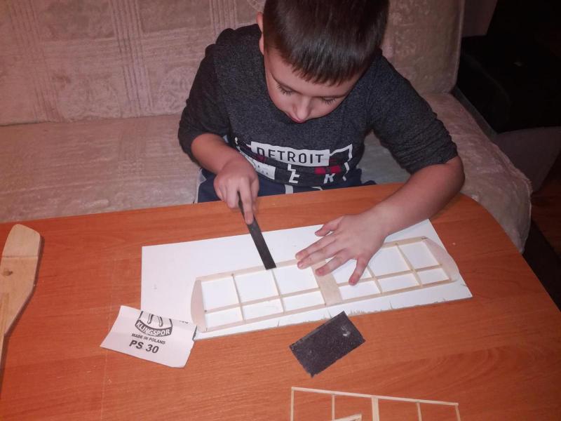 20. Ciąg dalszy. Patryk i jego zabawa z modelarstwem. Tym razem rozpoczyna bódowę modelu szybowca MŁODZIK-98. Jak dla niego nie będzie to łatwe zadanie ale z małą pomocą na pewno da radę. Nie mam takiej możliwości aby być przy nim cały czas i patrzeć co i jak robi. Ale kiedy się spotykamy staram się mu wytłumaczyć co i jak ma zrobić i z tym zadaniem zostaje sam. Efekty jego pracy mogę zobaczyć na drugi dzień lub na zdjęciach które dostaje. Pierwsze przymiarki i dopasowanie części. CDN.