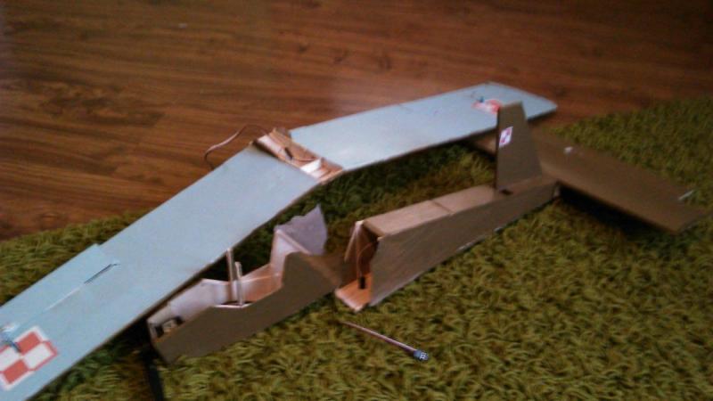 W przerwie od stukasa postanowiłem z resztek materiałów jakie mi zostały skleić niedużego wicherka "jednorazówkę" i taką się niestety okazał Lot trwał całe 13 sekund po czym model pofrunął w stronę ziemi a tyle z niego zostało: a tak jeszcze wyglądał godzinę temu : Rewelacyjnie może nie wyglądał ale ważne, że chociaż wzbił się w powietrze Spróbuje go jakos polepić i może jutro znowu wybiorę się na pole