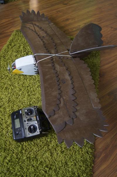 Jakiś czas temu znalazłem plany depronowego orzełka. Włożyłem do niego bebechy z pioneera- lata pięknie. Zacząłem buszować w internetach w poszukiwaniu kolejny latających zwierzątek. Trafiłem a to coś: Wrzuciłem do SolidWorks'a i wyrysowałem coś takiego ciut większego opartego o profil Kfm-3: Po jednym wieczorku rysowania zaczęło się cięcie i klejenie pianki na soudal 66A: kable serw schowałem w drugim stopniu skrzydła i dodałem listewkę sosnową 6x3 mm: z gładkiego depronu 5 mm wykonałem Statecznik pionowy: tak wyglądał w miarę poskładany: Pierwszą poprawką jaką wprowadzę do projektu to przesunięcie nieco głowy w tył bo akumulator wylądował za SC który ustaliłem sugerując się planami z sieci Pierwsza próba: Model przy skręcie wpadał w nie wiem jak to nazwać "korkociąg? " Dodałem Statecznik pod brzuszkiem: Tym razem model strasznie ciążył na ogon, leciał na śmigle i wylądował na ok 10-12 metrach. Z pomocą przyszedł sąsiad z długą drabiną (moja była za krótka), zmajstrowałem 8 metrową tyczkę i udało się model zrzucić na ziemię. Jedynym uszkodzeniem były urwane przednie łapki. Trzecia próba, akumulator przesunięty nieco do przodu, zaczynało się obiecująco jednak odmówił współpracy i odpadła dźwigienka jednej z lotek. Jutro dalej będę walczył z prototypem. Na koniec kilka danych modelu: Rozpiętość ok 730 mm Długość ok 900 mm Masa 480 g Serwa na lotkach 9g Serwo SW 13g Silnik i regulator: Redox 850/1400 + Redox 40A dużo za duży do tego modelu, odziedziczył go po innym modelu. Docelowo ma być to emax 2812 i reg. 20A