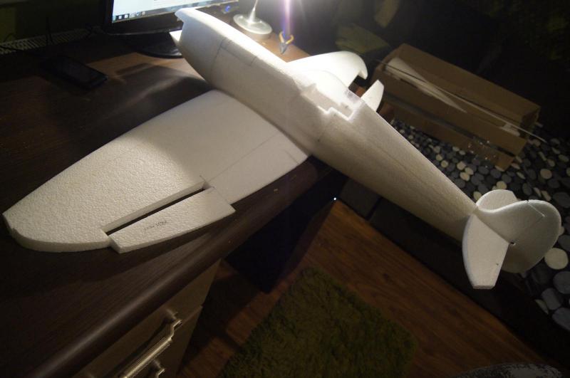 8. Bf-109 poleciał więc kolej na kolejną część prezentu Zdjęcie zawartości pudełka: I takie zdjęcie porównawcze z bf'em: Wzór malowania (pilot pewnie wielu znany) Mam dwa tygodnie ferii więc na 99% poleci do końca stycznia. Zrezygnowałem z chowanego podwozia, będę lądował na brzuchu chyba, że spit miał jakieś podwieszane zbiorniki czy inne ustrojstwa Wyposażenie jakie planuję to : Silnik Redox Brushless BBL 850/1400 (nie wiem czy nie będzie za słaby ciąg statyczny to ledwie 880g) Regulator Redox 40A v2 (taki mam w domu) 4x Serwomechanizm Tower Pro SG-92R Zasilaniem będą 2 akumulatory 1300 mAh takie jakie mam w modelach ESA Edit: Rozrysowałem lotki: I wstępnie przymierzyłem sklejkowy stelaż/półkę czy jak kto woli: Chyba powinno być dobrze... Tak to jest jak się robi coś bez instrukcji posiłkując się zdjęciami z innych relacji