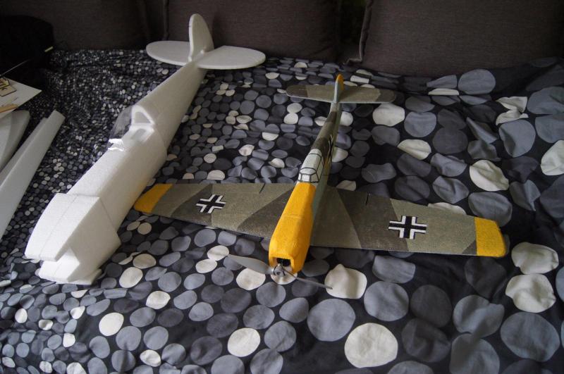 22. W związku z niemiłą przygodą mojego Pzl-62 szukałem dla niego następcy... jednakże w sylwestra się sprężyłem i naprawiłem tego nieszczęśnika. No ale od przybytku głowa nie boli więc.... Trafiło na Mesia od Pana Marka... Tak się złożyło że, wymieniałem w międzyczasie model xl spitfire więc oba modele przyszły w jednej paczce co za tym idzie radocha była x2 Planowane wyposażenie: Silnik Redox Brushless BBL 450/1400 Regulator Redox 20A Śmigło APC 8x6 E 3x Serwomechanizm Tower Pro SG-90 Pakiet ABC Power 1300 mah Poniżej zdjęcie zestawu: Co do wersji to nie wiem ponieważ skrzydełka mają ścięte końcówki co odpowiadałoby wersji E ale pewnie dorobię je z kawałka pianki i powstanie planowana od początku wersja G z tym malowaniem: A na deser zawartość drugiego pudła: co do spita założę inny wątek w dziale średnich modeli bo będę miał mnóstwo pytań z nim związanych