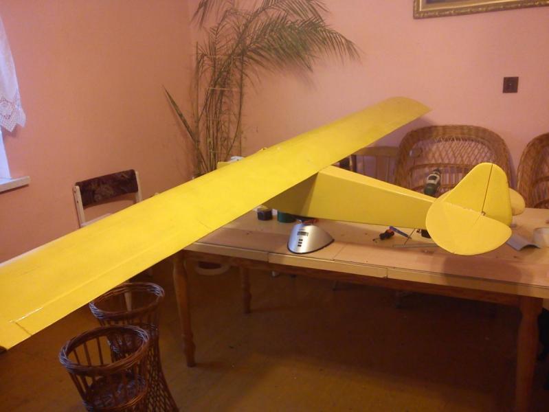 Witam, chciałbym wam przedstawić mojego trenerka kształtami przypominającego Pipera. Model zacząłem robić tydzień temu, po tym jak w domu znalazłem trochę arkuszy starego styropianu i tak zacząłem wycinać sobie drutem skrzydła- Profil Clark Y. Potem wystarczyło dorobić kadłub, kadłub jest trochę za mały w stosunku do skrzydeł, ale niestety nie miałem więcej podkładów w domu a nie chciało mi się ganiać do sklepu Skrzydła mają dźwigar z sosny 10x5mm, niedzielone, mocowane do kadłuba na 2 śruby m6, oklejone na natarciu i spływie warstwą zwykłego papieru do drukarek a całość jest oklejona papierem pakowym. Boczne ściany kadłuba wykonane są z pokładu pod panele 5mm i wzmocnione listwami sosnowymi, dół kadłuba i góra natomiast wycięte są z climaporu, stateczniki również z climaporu. Całość z wyposażeniem waży około 1500-1700g z tym, że musiałem na dziób dołożyć jeszcze jeden pakiet i około 40g żelaza:D Model ma zamontowane: 4-serwa 9 gramowe (wiem, że trochę za małe do tej wielkości modelu) silnik: ABC-Power D4018 Regulator: ABC-Power 30A 2 pakiety: Turnigy 2200mah-3s Dzisiaj odbył się oblot modelu niestety nie mam filmu,znaczy się mam jedynie jak sam kręciłem, ale za dużo nie widać bo wiadomo źle się kreci i steruje jednocześnie Model lata całkiem dobrze Trochę ma długie podejścia do lądowania (10 razy albo więcej podchodziłem do lądowania) jest wolny myślę, że początkujący nawet sobie by z nim poradził, lata się praktycznie jak motoszybowcem, wznoszę się a potem sobie powoli szybuje do dołu. Latałem dzisiaj około 40min a pakiety mają jeszcze po 11,2V Korekty wymaga jedynie skłon i wykłon silnika bo bardzo zadziera do góry i kręci non stop w lewo. Pozostaje tylko go ozdobić i trochę poprawić malowanie Dodaje parę zdjęć z budowy i po oblocie Pozdrawiam Konrad