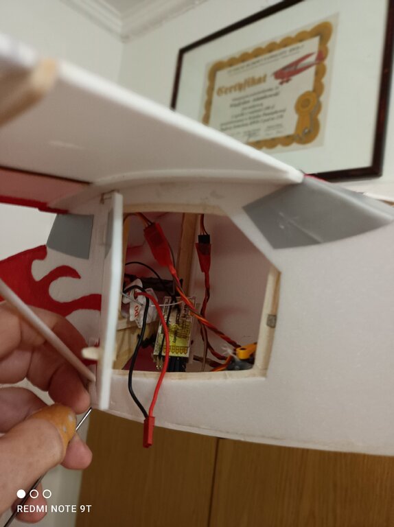 Silnik taki jak w załączniku, reg. 10A, odbiornik jaki miałem wolny -FrSky 6Ch, pakiet 450 2S. Do zdjęcia wyciągnąłem bebechy z ustalonych miejsc. -