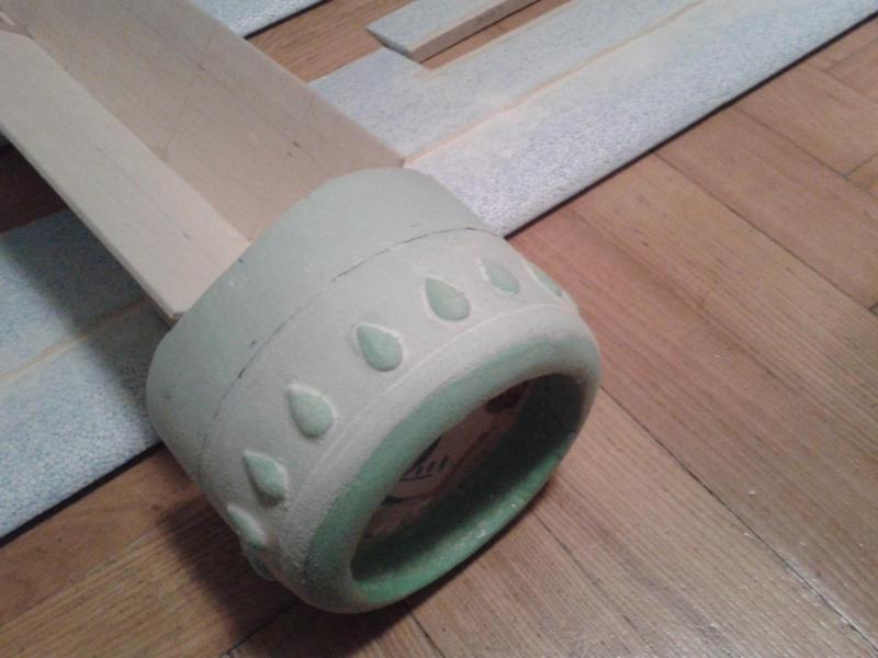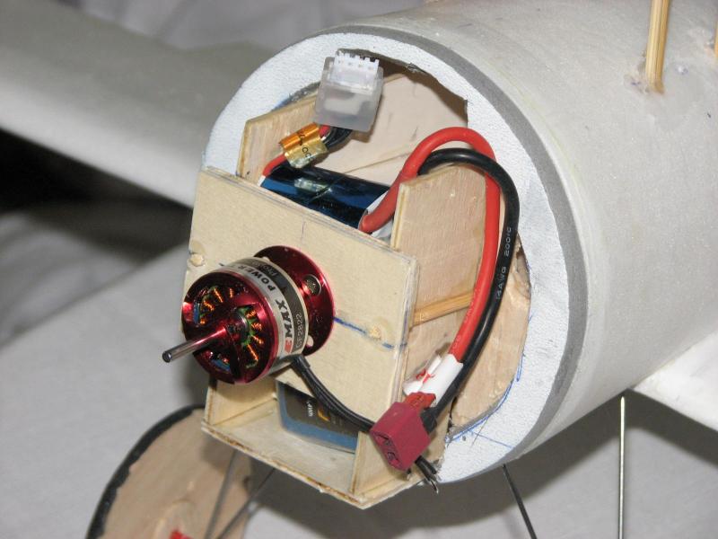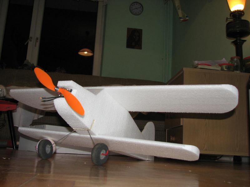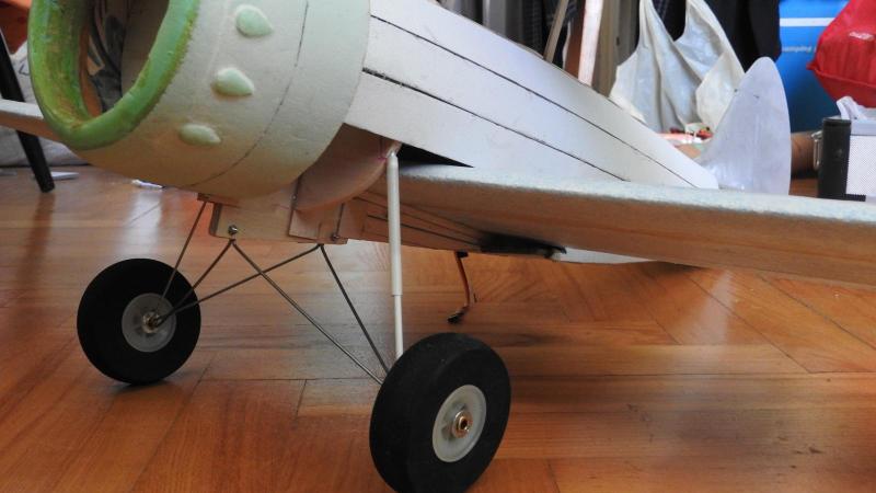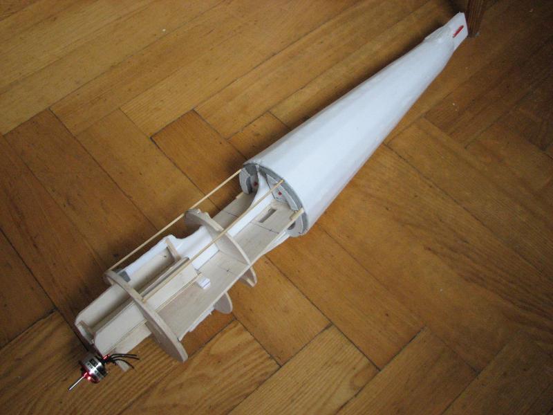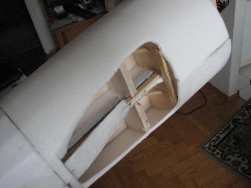 Rdzeń kręgowy oraz newralgiczne wręgi z balsy, pozostałe wręgi, pokrycie i stateczniki z "klimaporu" -płyty do ocieplania ścian do nabycia w dużych Castoramach. We wręgę podwoziową wklejona jest aluminiowa rurka, w której z odpowiednim luzem podłużnym (~1,5 cm) pracuje "amortyzator". Wszystkie elementy podwozia wygiąłem z drutu stalowego 1,5mm.
