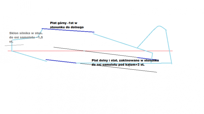 Nim odpowiem wytłumaczę się z kilku uproszczeń jakie stosuję na własne potrzeby aby nie irytować aerodynamików uczonych w piśmie. W profilu Clark Y za cięciwę i kąt 0 przyjmuję dolny profil, ramię statecznika to u mnie odległość od krawędzi spływu skrzydła do początku statecznika poziomego bez względu na jego skosy. To taka łopatologia dla świeżych amatorów. Gdzieś w swoich szpargałach dawno temu czytałem o trzech sposobach klinowania skrzydeł w dwupłatach, 0, + i - w zależności od przeznaczenia modelu. Ni diabła nie mogę znaleźć źródła. W swoich poczynaniach zacząłem zabawę od 0 przez dolny na +, górny 0. Teraz zrobiłem dolny 0, górny -. Po wytrymowaniu model lata jak marzenie. Przy określonej prędkości staje się prawie symetryczny w lataniu. Zarówno w locie normalnym i odwróconym można puścić drążki. Opisałem co i jak zrobiłem z pozycji majsterkowicza, zagadnienia teoretyczne pozostawiam zawodowcom. Nieco lotu tutaj