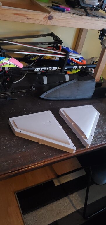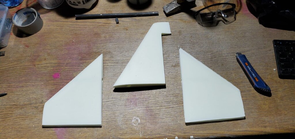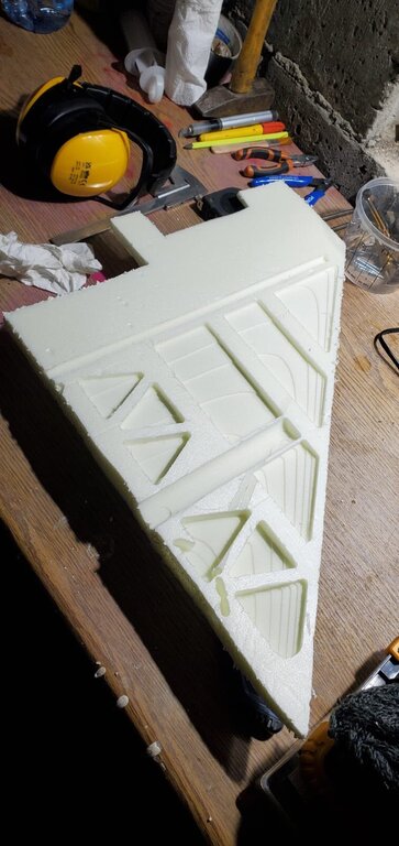 Czekam z niecierpliwością żeby zobaczyć jak latasz logo , jeśli chodzi o nowy projekt to główna zmiana to jeżdżąca brama. Prace idą powoli, udało mi się wyfrezować już komplet stateczników. Zdecydowałem że je zalaminuje pod mylarem i wrzucę do wora. Myślę że w przyszłym tygodniu wezmę się za skrzydła, tutaj lekko zmodyfikuję plany bo frezowanie ich powierzchni zajmuje za dużo czasu oraz wytwarzanie już sobie przećwiczyłem frezując je oraz stateczniki(strategie obróbki, frezy walcowe i kulowe itd.). Zrobię tak że wyfrezuję wnętrze jak na zdjęciu z pierwszego postu a powierzchnię wytnę drutem, przyśpieszy to nieco prace i na frezarkę już wrzucę kadłub. Zestaw stateczników prezentuje się tak: ten z prawej ma jeszcze nadmiary pianki nie odcięte. Wewnątrz są już kieszenie na rurki węglowe na których będą montowane stateczniki do kadłuba.